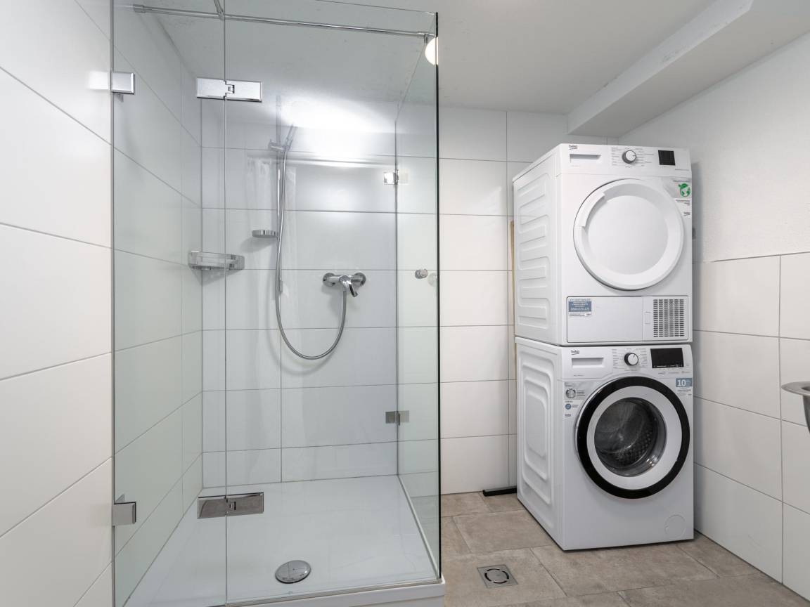 Souterrain: Badezimmer mit Wäschetrockner, Dusche, Waschbecken, Toilette, Waschmaschine