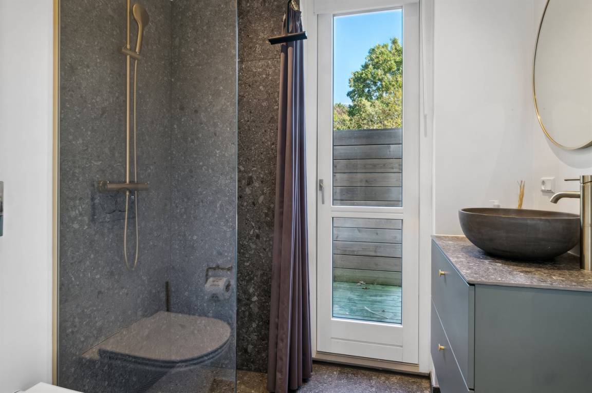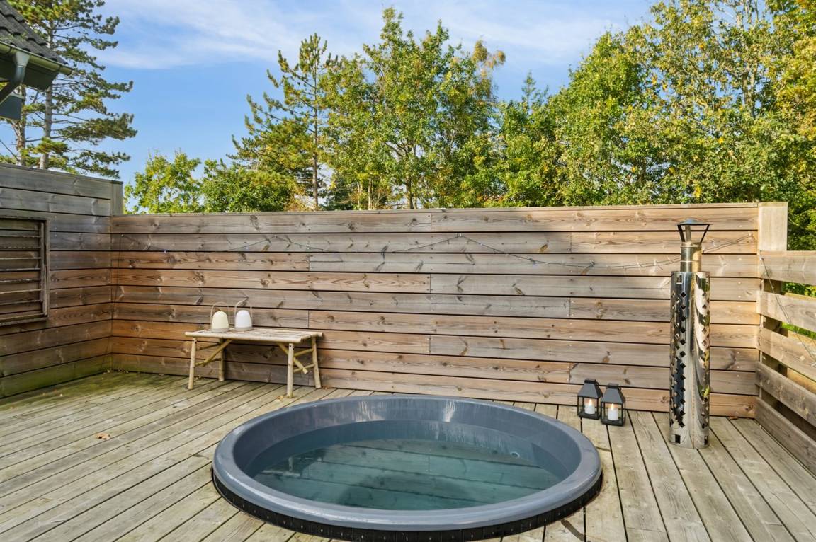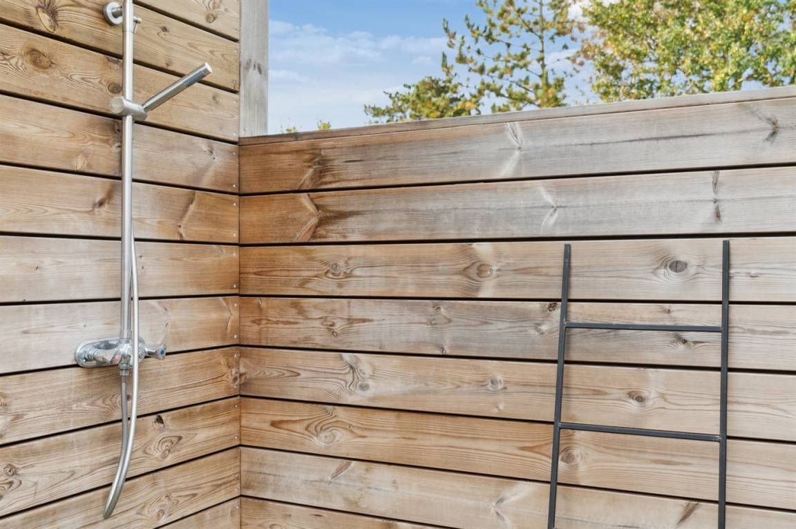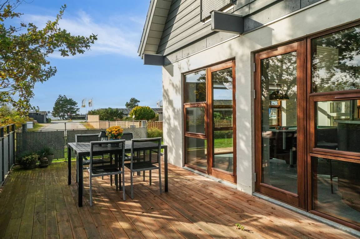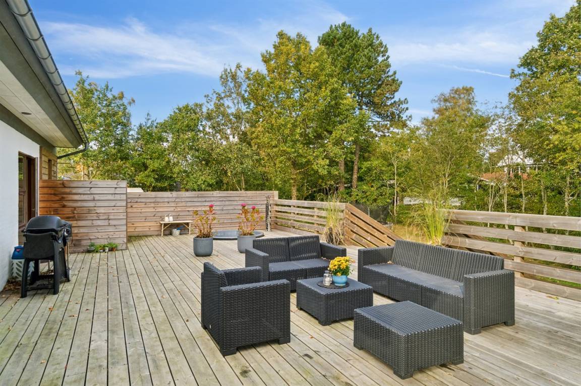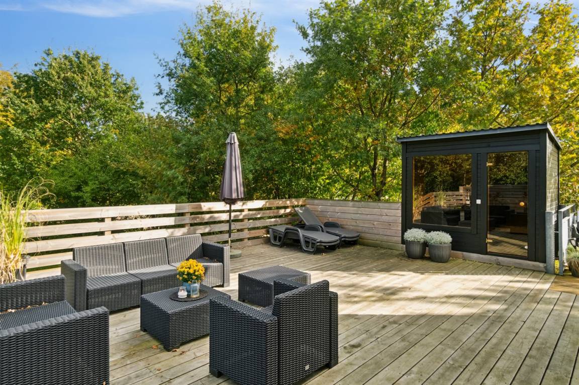 Das Haus ist von schönen Holzterrassen mit Gartenmöbeln, Liegestühlen, Sonnenschirm und Grill umgeben. Vom Wohnzimmer im Obergeschoss hat man Zugang zu einem großen, herrlichen nach Westen ausgerichteten Balkon mit Ausblick. Auf der besonders großen, nach Osten ausgerichteten Holzterrasse gibt es neben einem fantastischen Hot-Tub für 6 Personen auch eine Außensauna und eine Außendusche, die während der Sommermonate benutzt werden kann. Ein außergewöhnlich gut gelegenes und schönes Haus.
