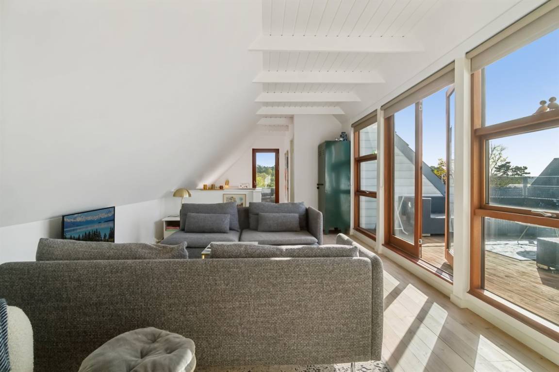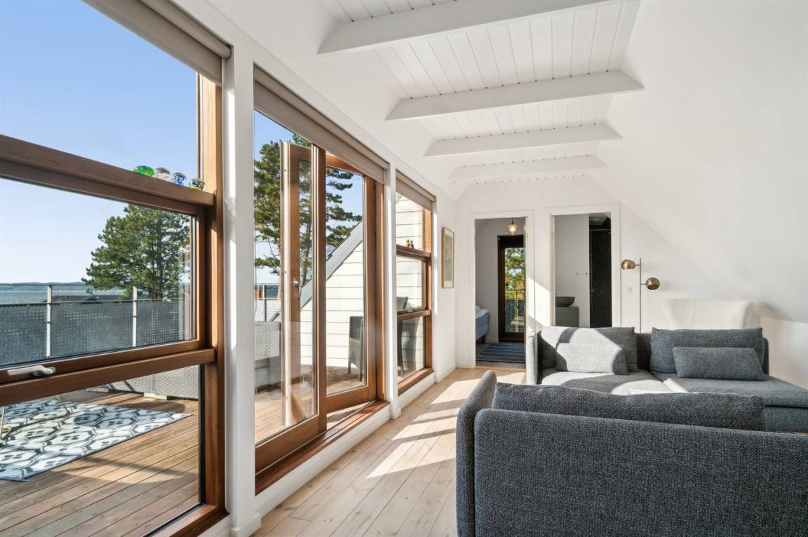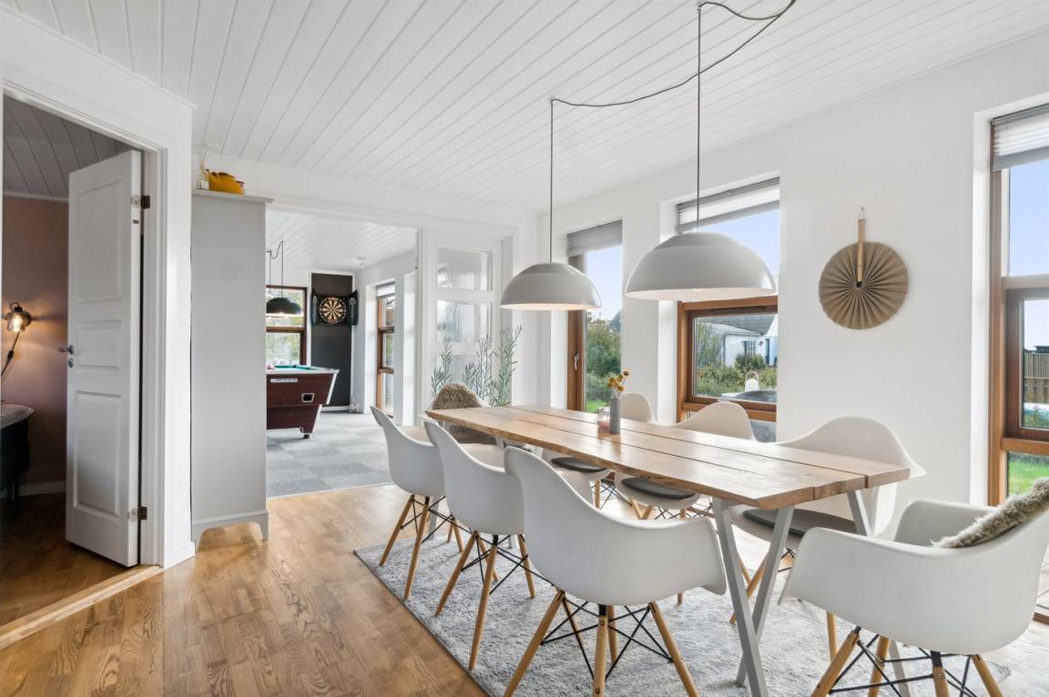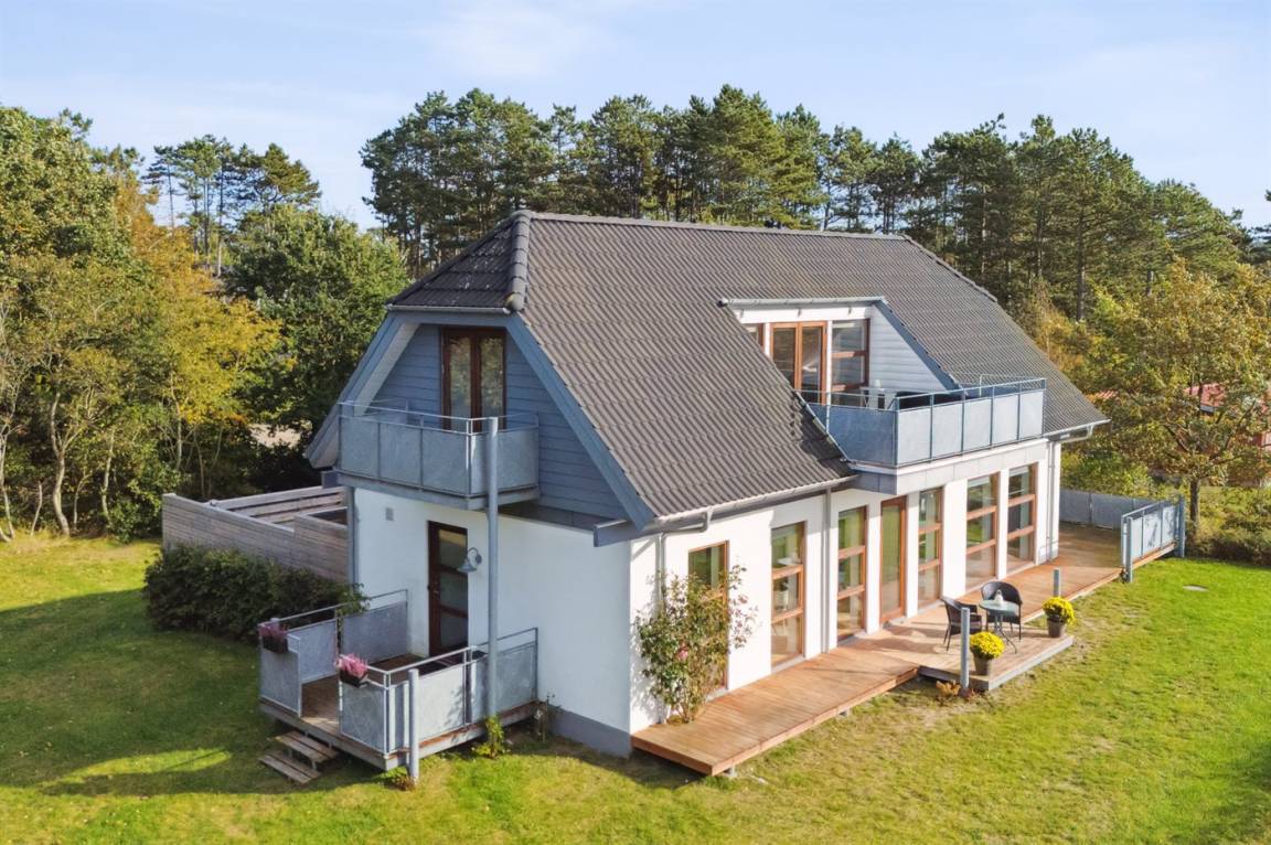 Angrenzend an das Wohnzimmer und durch eine Glastür getrennt, liegt der große Multifunktionsraum mit u. a. Billardtisch und Darts. Von hier führt eine Wendeltreppe in das Obergeschoss, das mit einem gemütlichen Wohnzimmer mit Meerblick und Zugang zum Balkon, bequemen Sofas, einem TV mit dänischen (inkl. TV2) und deutschen Fernsehsendern sowie einem Radio ausgestattet ist. Die 8 Schlafplätze verteilen sich auf 4 gemütliche, helle Schlafzimmer mit Doppelbetten – 2 im Erdgeschoss und 2 im Obergeschoss, eines davon mit eigenem Balkon.