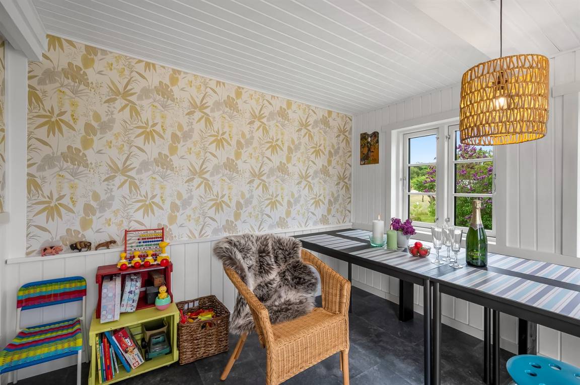Es gibt einen schönen Wintergarten mit einer Spielecke für die Kinder und einem großen Esstisch für die ganze Familie. Die Küche ist mit Kühlschrank, Gefrierfach, Induktionskochfeldern, Umluftofen, Mikrowelle und Geschirrspüler ausgestattet.