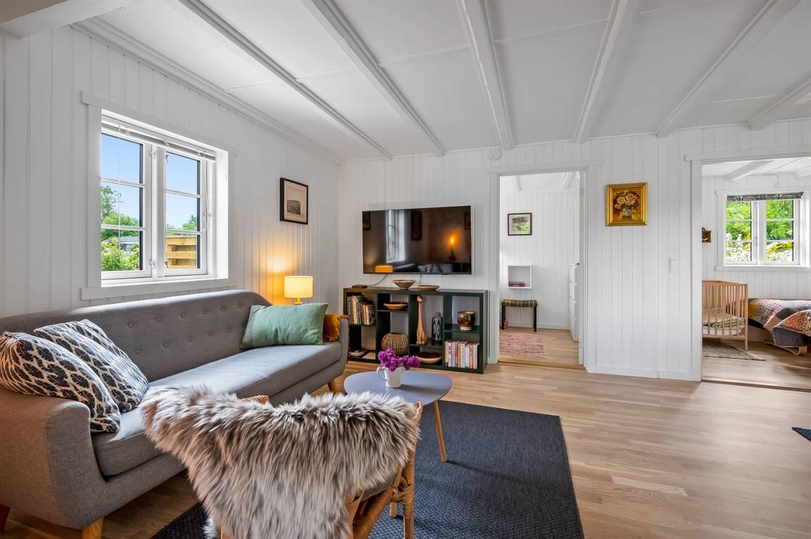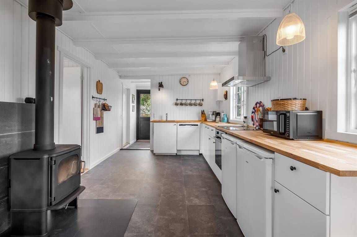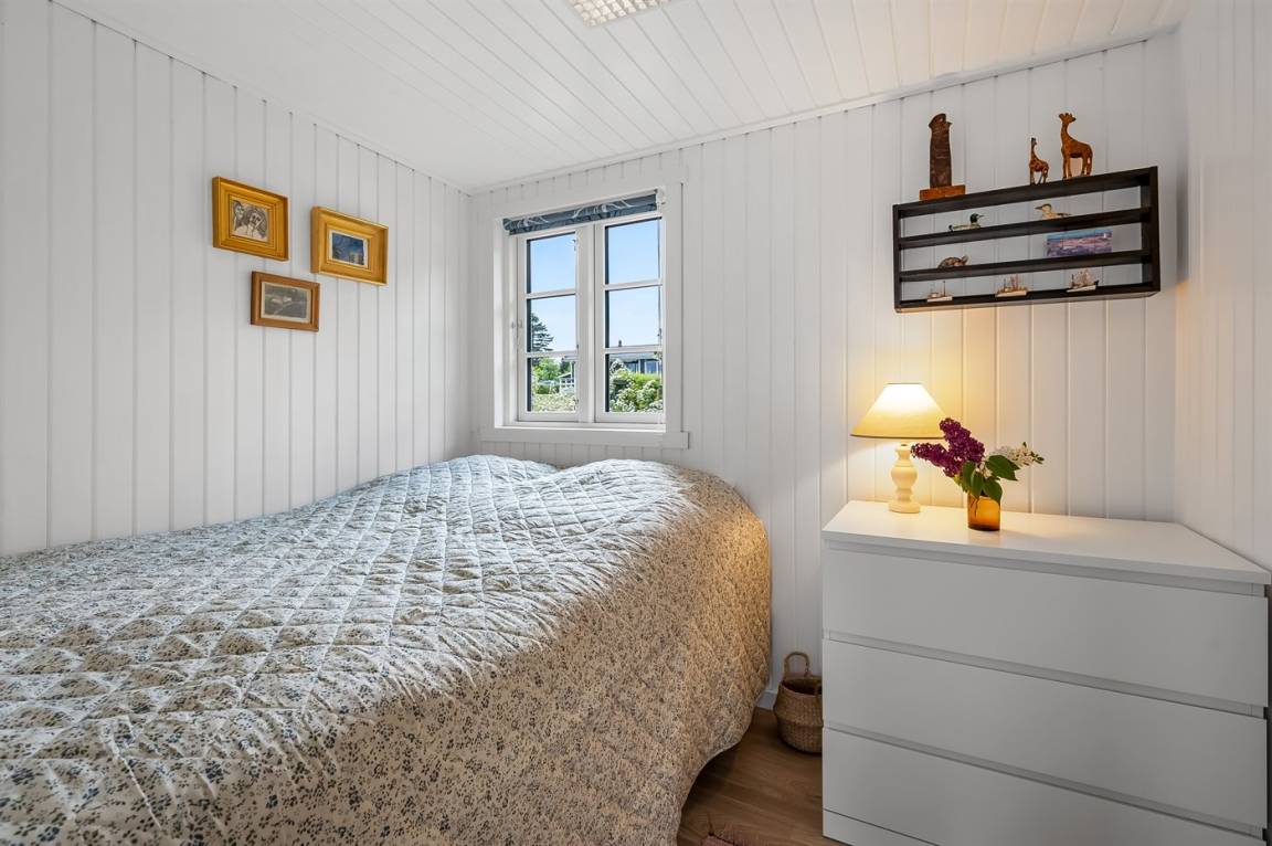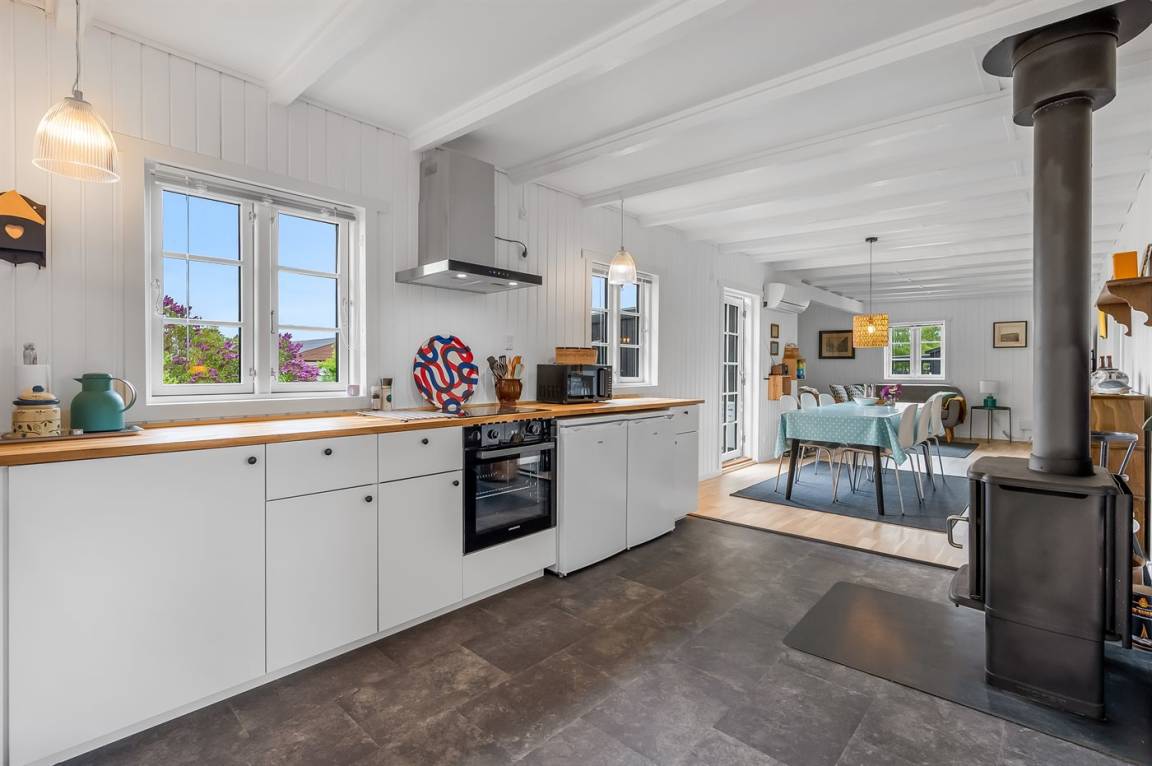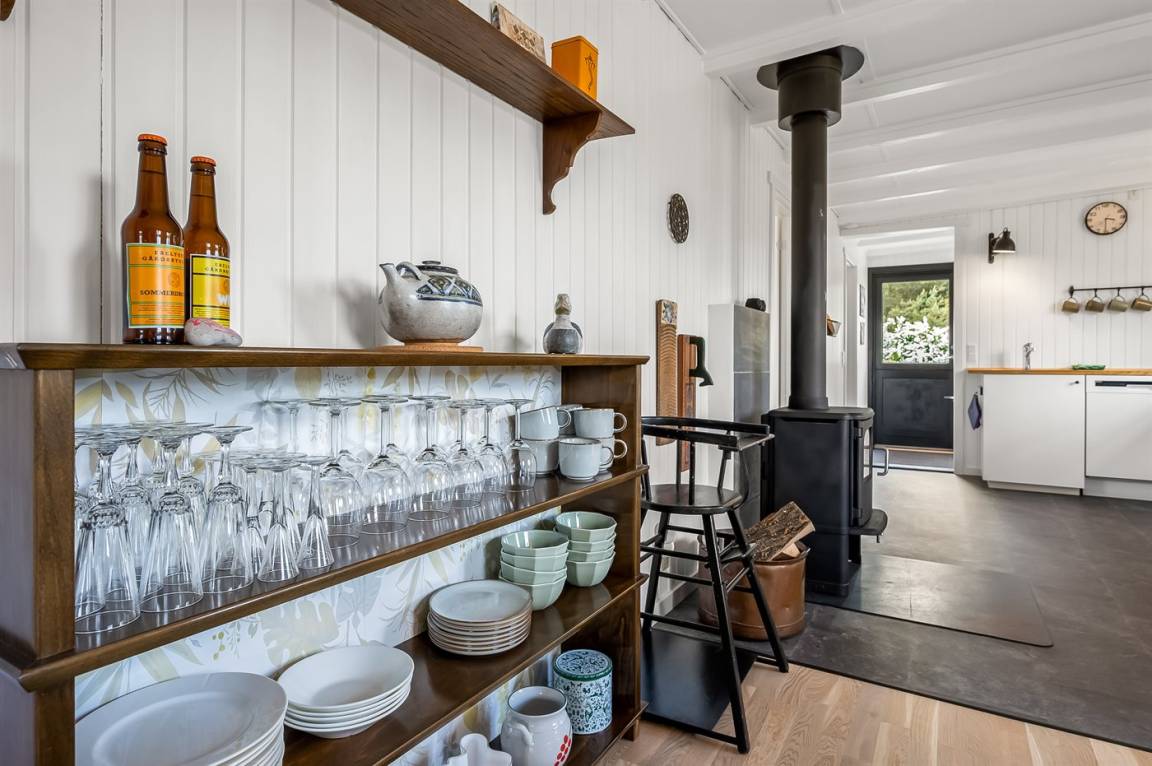 Das Haus ist hell und modern eingerichtet und die Schlafplätze verteilen sich auf 3 Zimmer; 1 mit Doppelbett (160 x 200 cm), 1 mit Doppelbett (140 x 200 cm) und 1 mit 2 Einzelbetten (80 x 200 cm). Der Mittelpunkt des Hauses ist das gemütliche Wohnzimmer mit Kaminofen, das offen mit der Wohnküche verbunden ist.