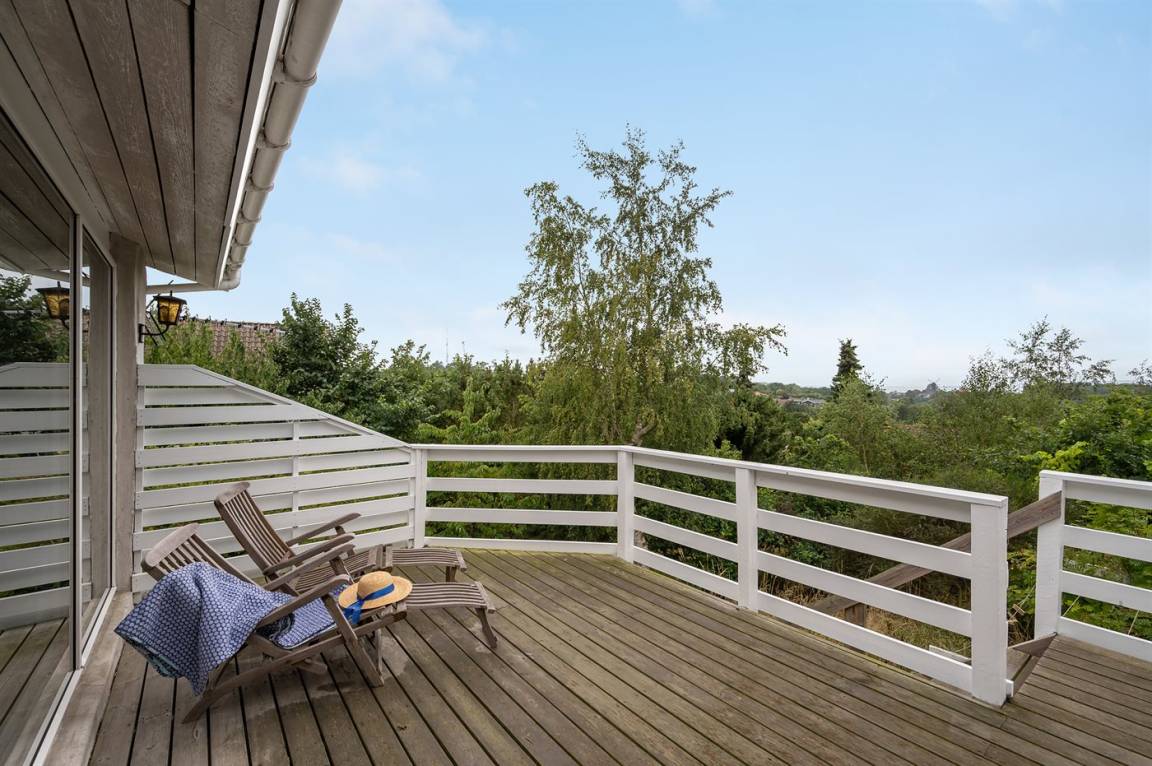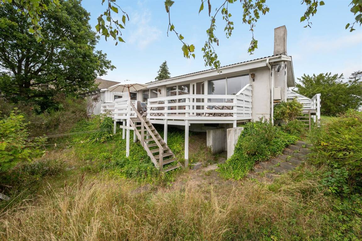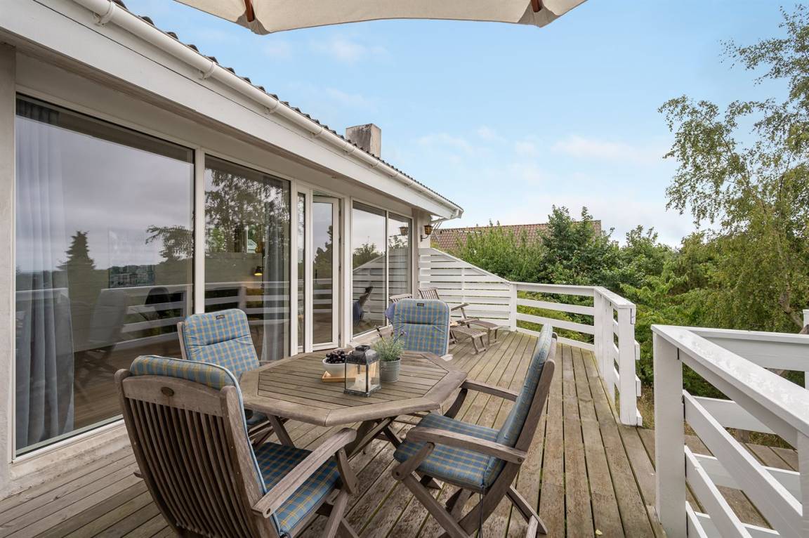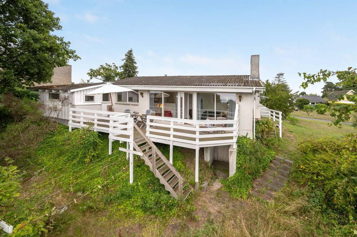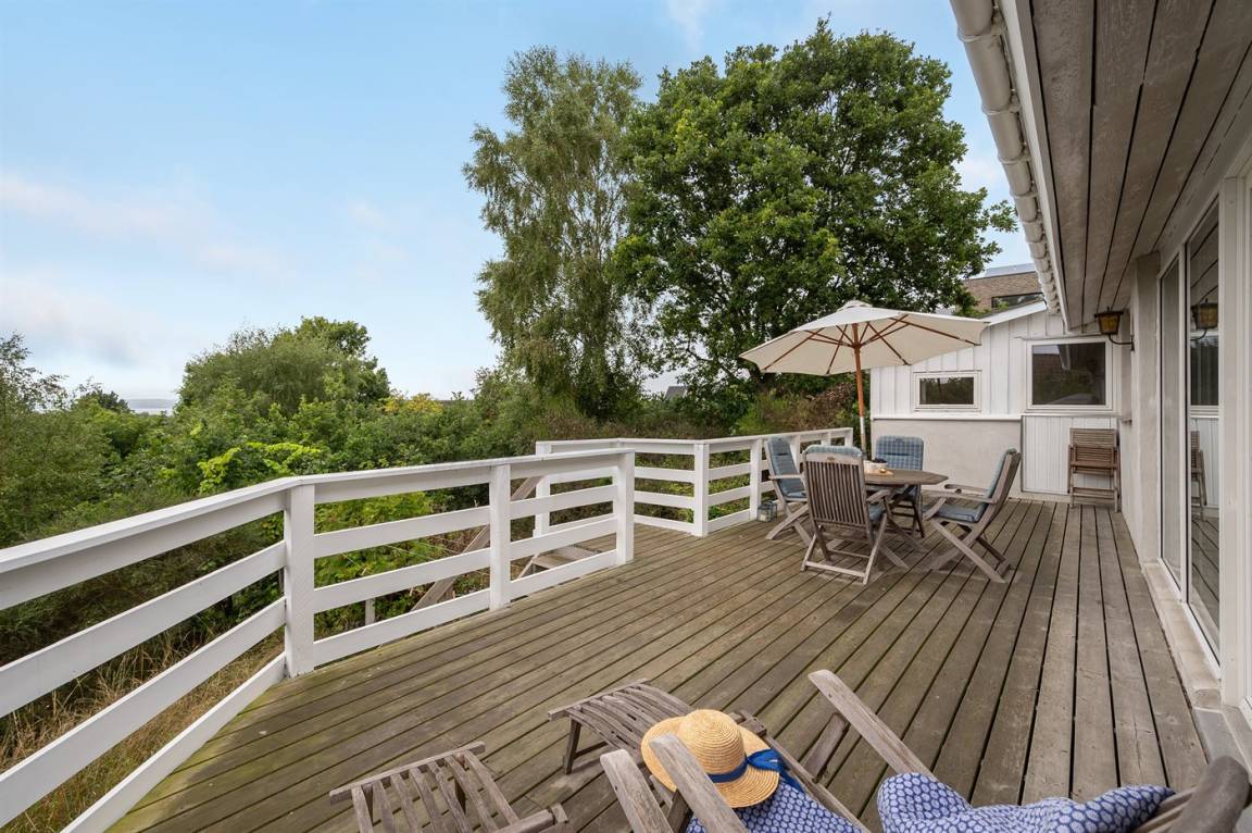 Schönes Ferienhaus mit romantischem Naturgarten und einer schönen Aussicht von der herrlichen Terrasse, von der ihr u. a. das Meer und die Fregatte „Jylland" sehen könnt.