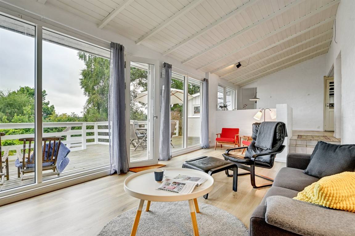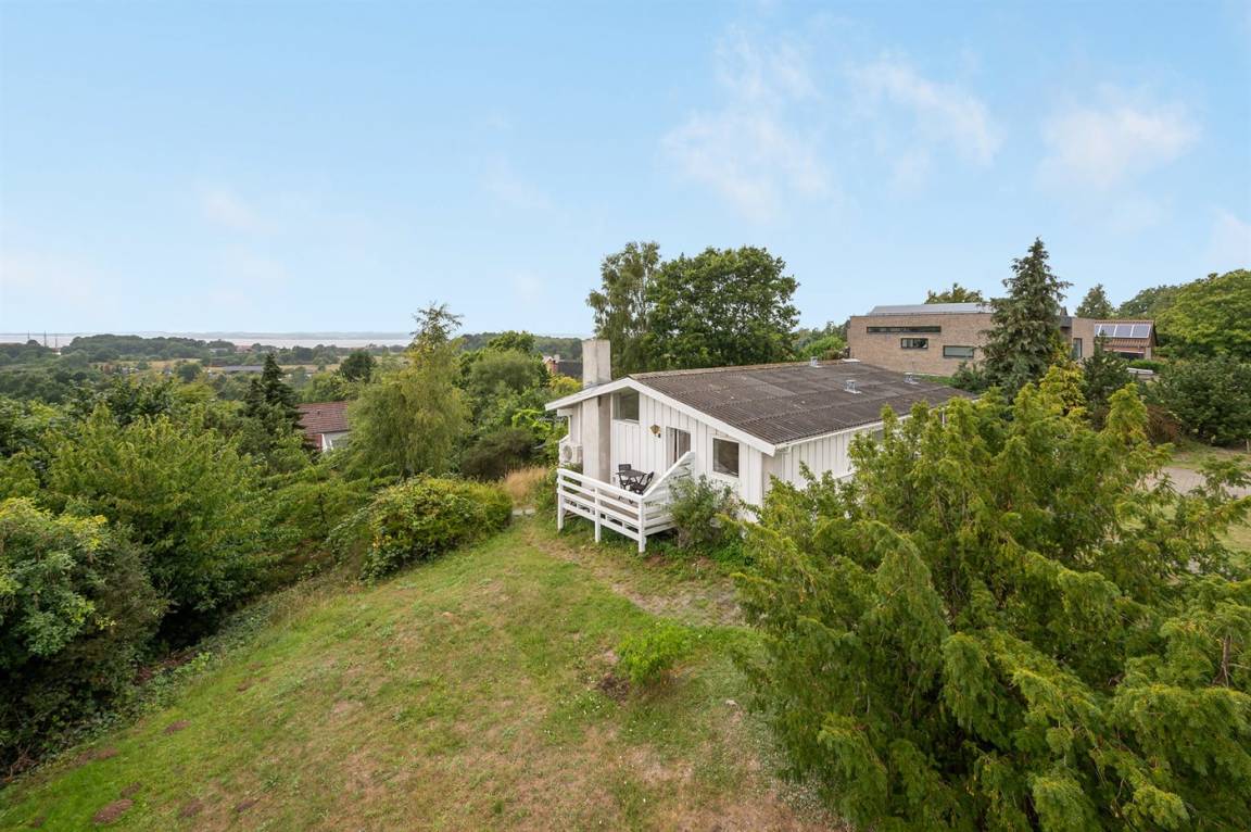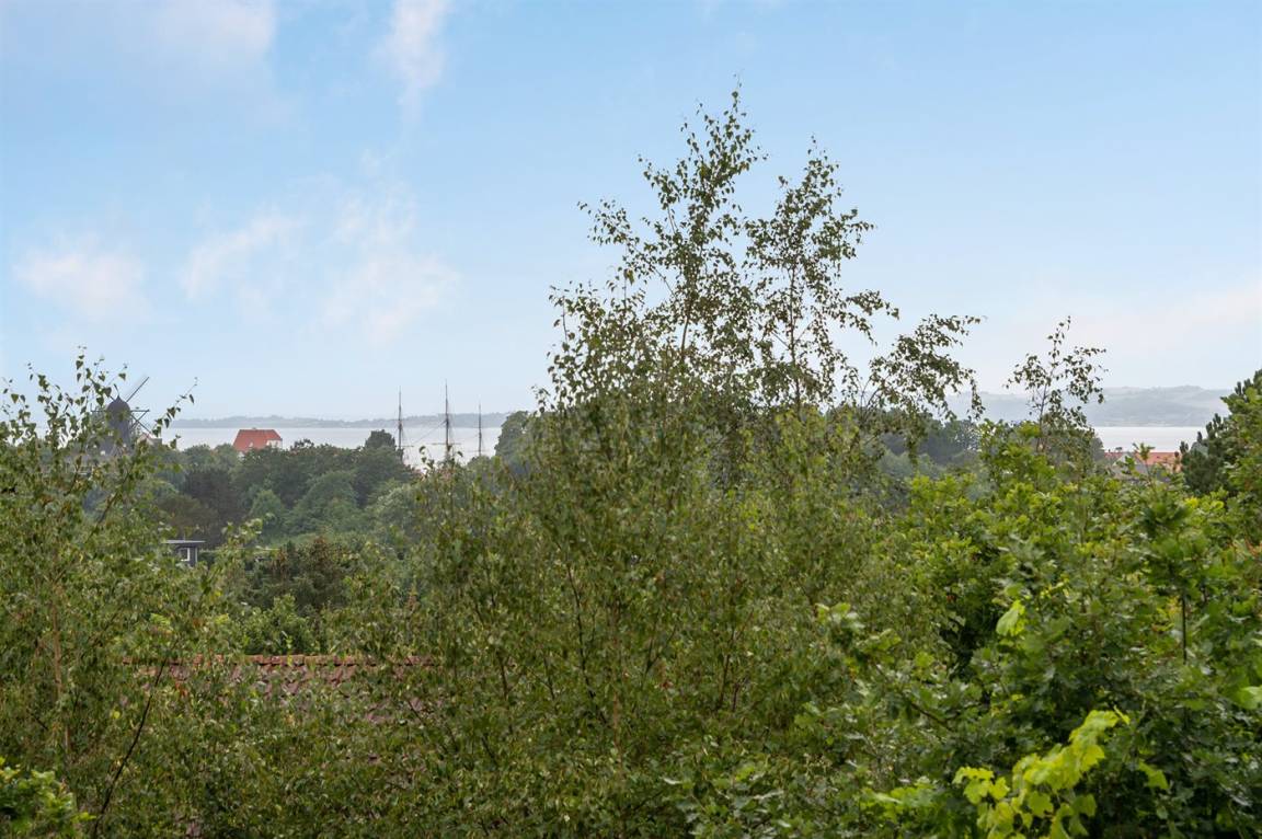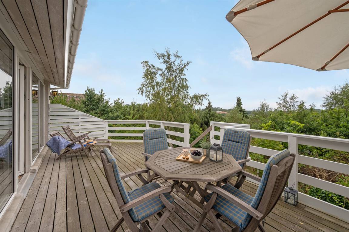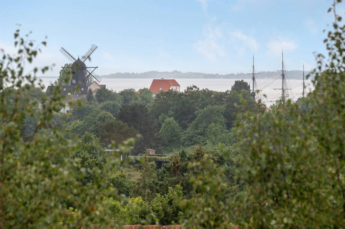 Schönes Ferienhaus mit romantischem Naturgarten und einer schönen Aussicht von der herrlichen Terrasse, von der ihr u. a. das Meer und die Fregatte „Jylland" sehen könnt.