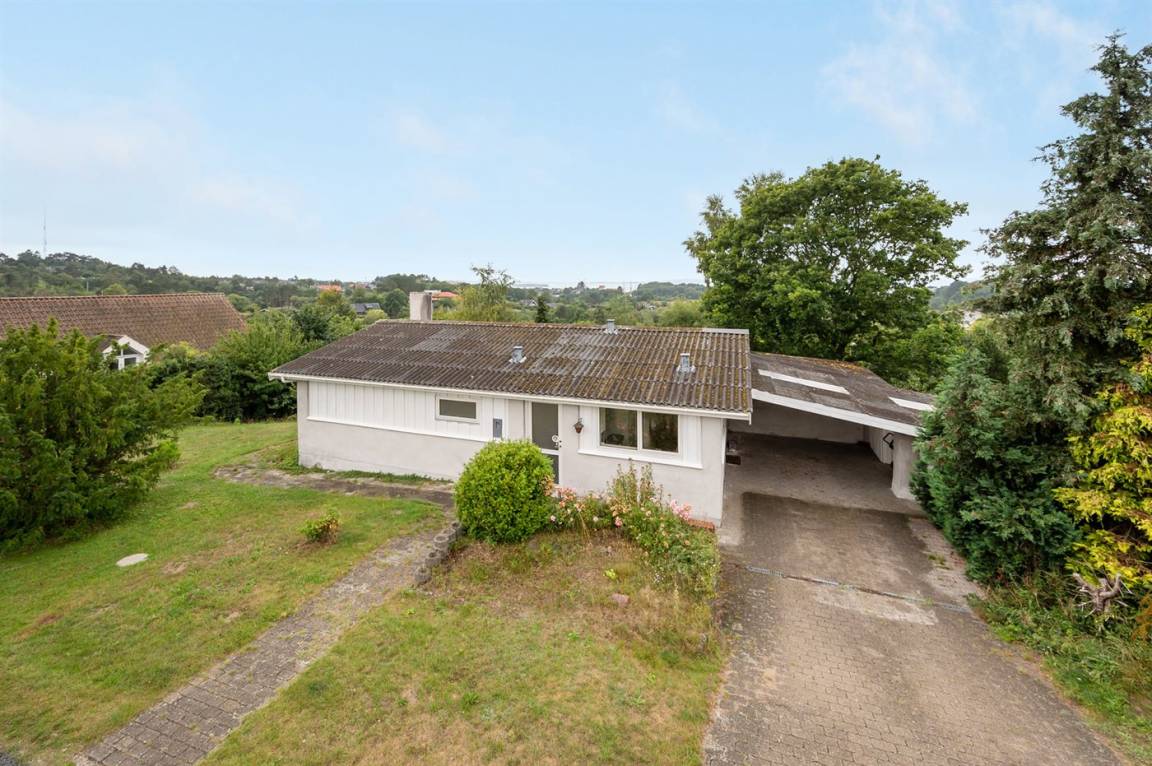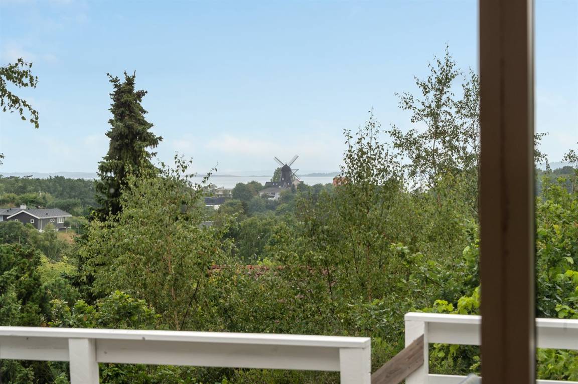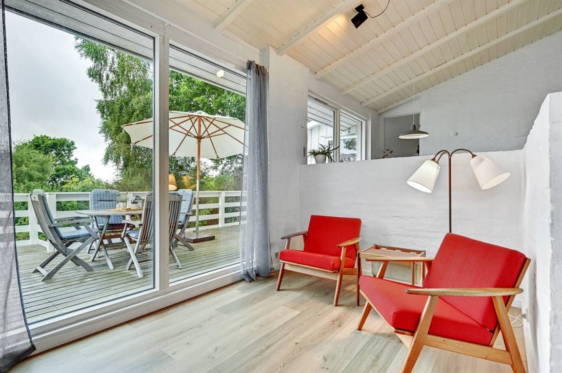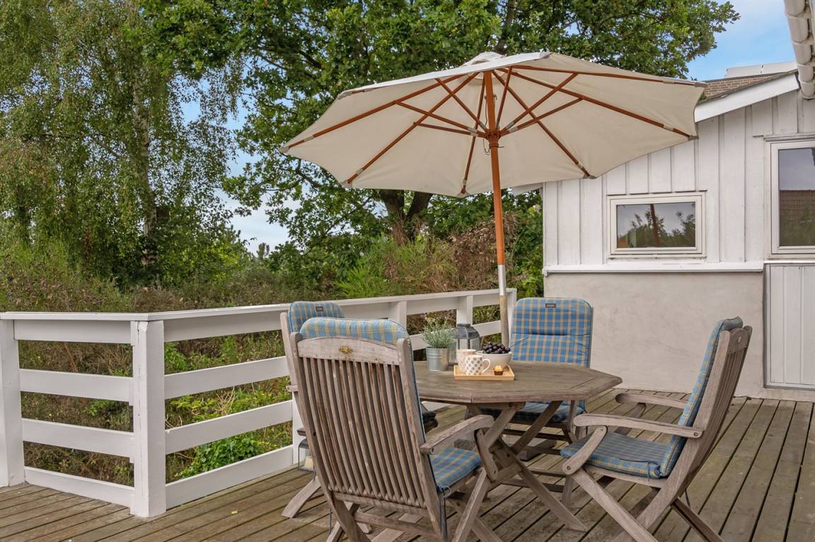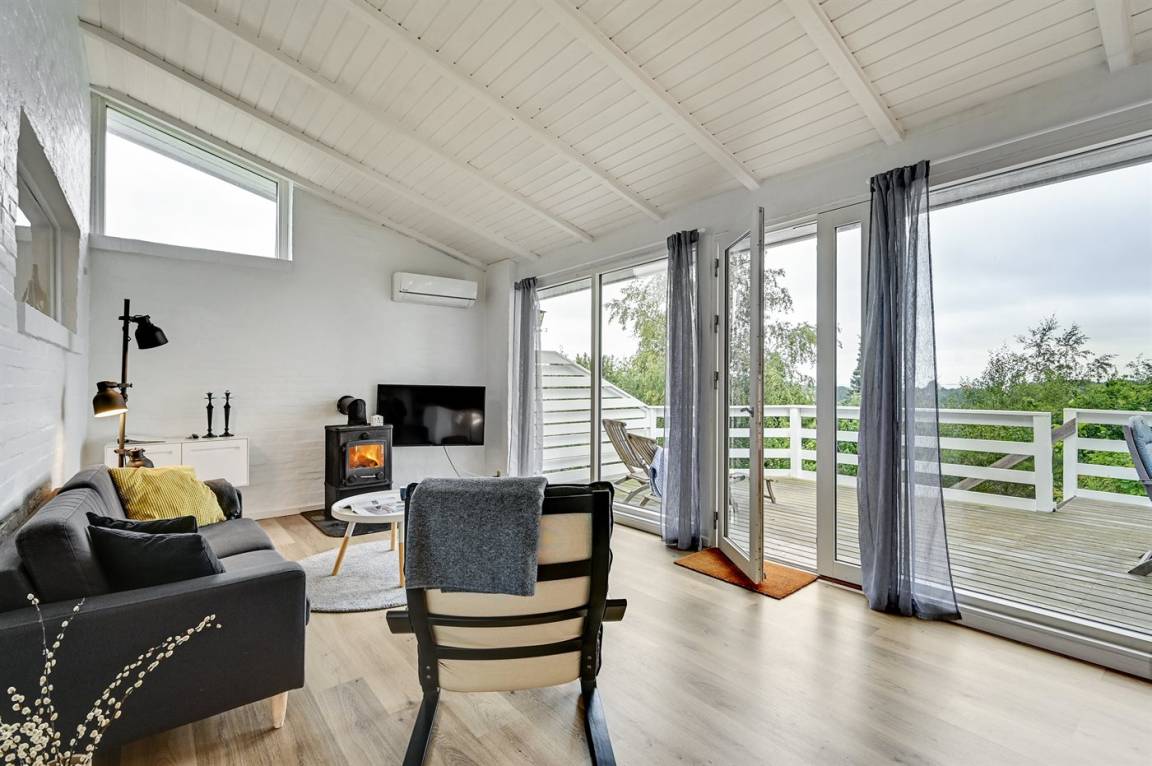 Schönes Ferienhaus mit romantischem Naturgarten und einer schönen Aussicht von der herrlichen Terrasse, von der ihr u. a. das Meer und die Fregatte „Jylland" sehen könnt.