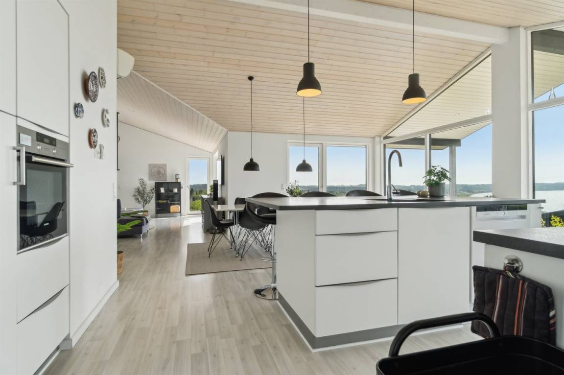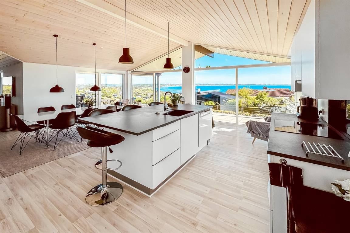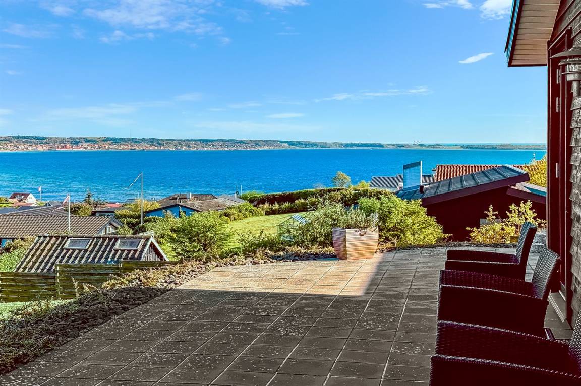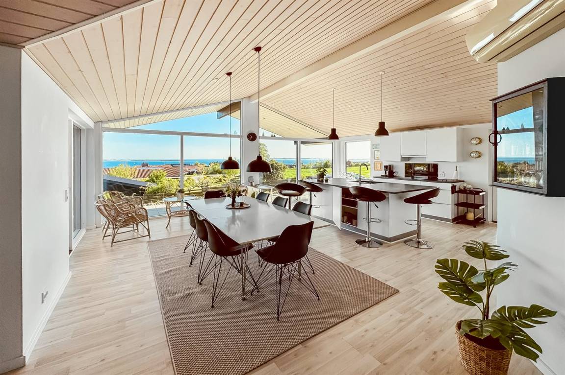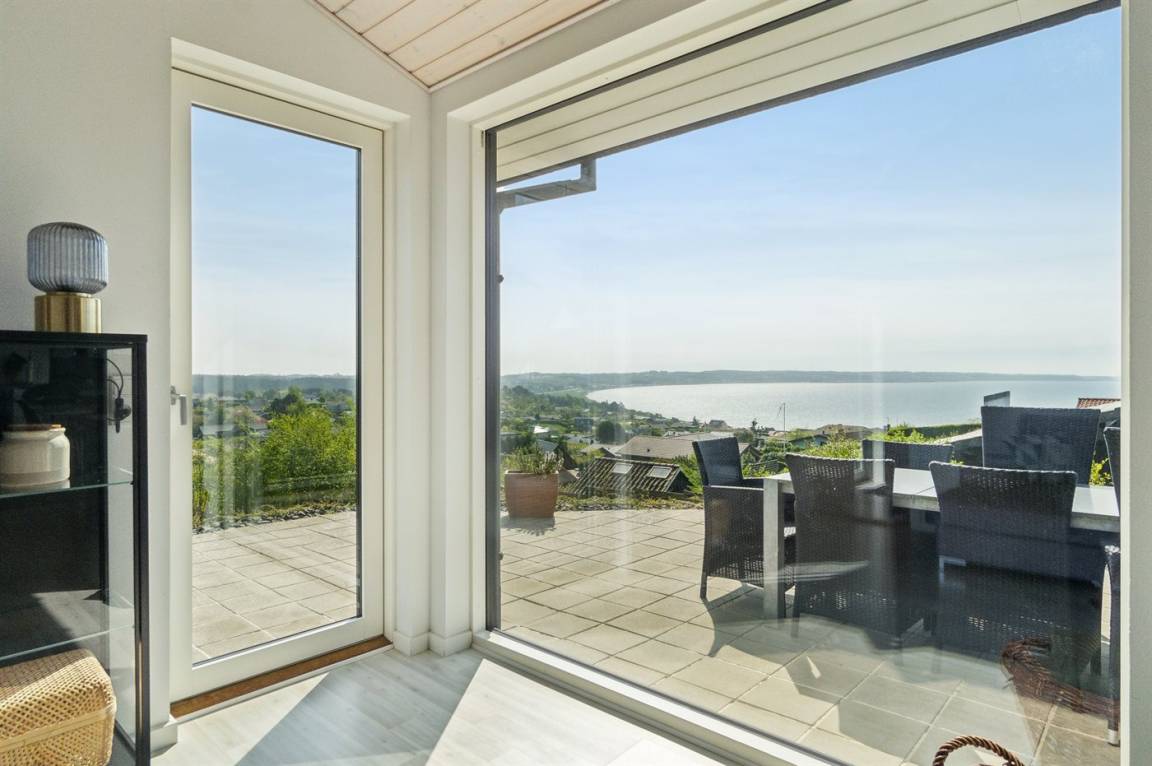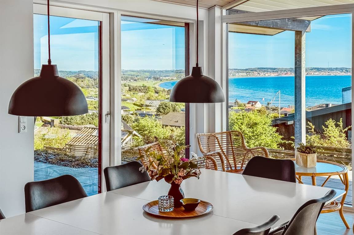 Wunderschön und erhöht gelegenes Ferienhaus mit Panoramablick auf das Meer und das Städtchen Ebeltoft. In Ebeltoft können Sie zum Beispiel die Fregatte Jylland besichtigen. Das Haus liegt in Hanglage am Ende einer Sackgasse, die in eine große Grünfläche mit einem fantastischen Aussichtspunkt mündet. Ganz in der Nähe liegt ein schöner, kinderfreundlicher Badestrand mit einem Badesteg, auf dem Sie Krabben fangen können. Der Strand eignet sich ebenfalls ideal zum Kite- und Windsurfen.