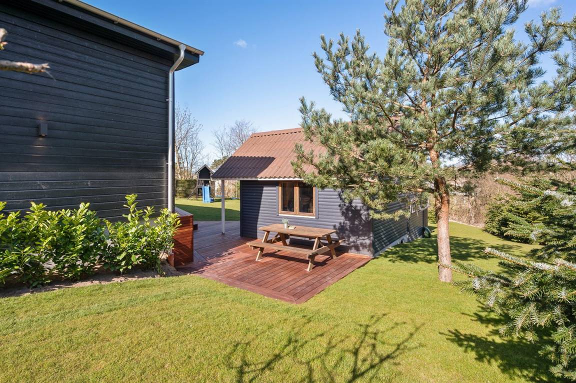 DraußenDie Ferienunterkunft liegt auf einem 1420 m² großen Gartengrundstück. Das Grundstück ist eingezäunt. Die Entfernung zum Meer beträgt 250 m. Die nächste Einkaufsmöglichkeit liegt 750 m entfernt. Es steht ein 100 m² Terrassenareal zur Verfügung. Außerdem gibt es 30 m² überdachte Terrasse. Geräteraum. Schaukel. Spielturm. Rutsche.Lagerfeuerstelle. Es steht ein Grill zur Verfügung. Parkplatz auf dem Grundstück.