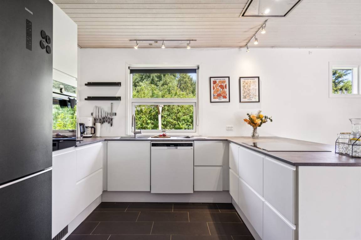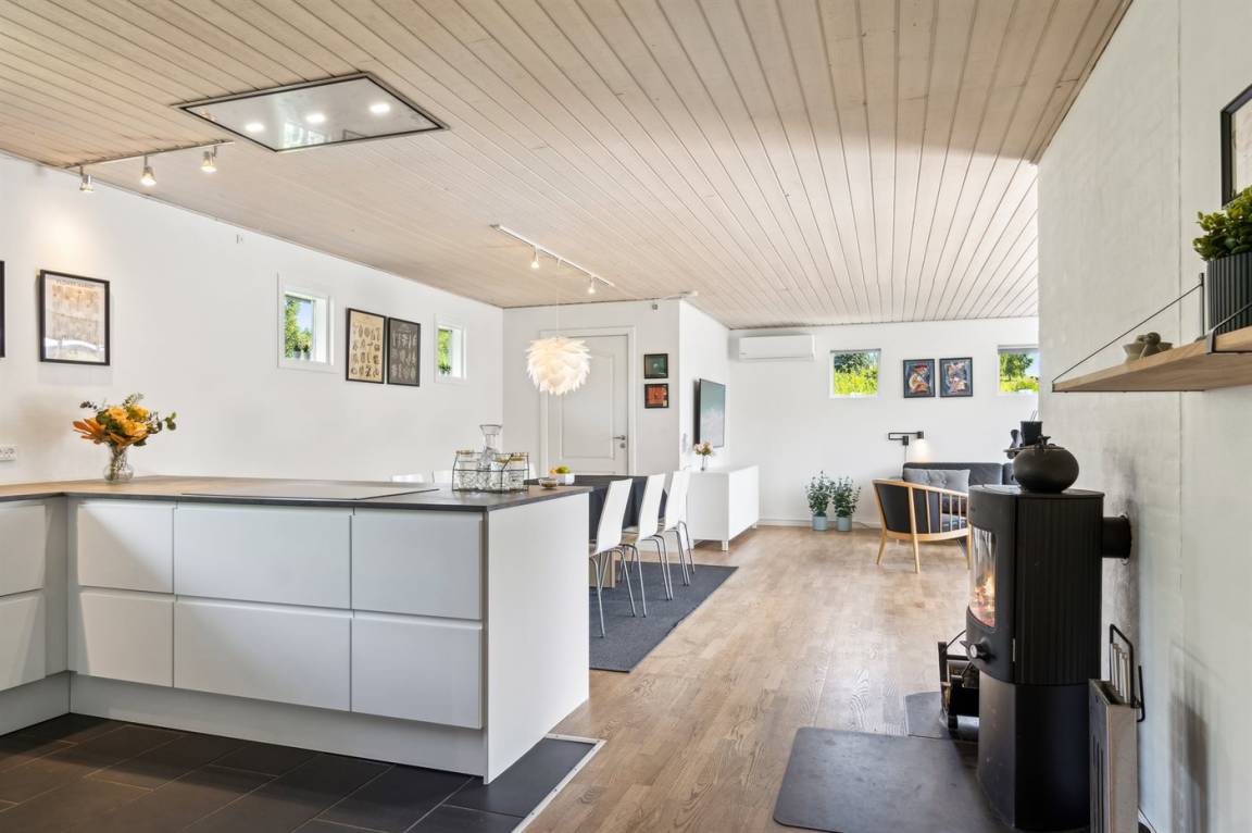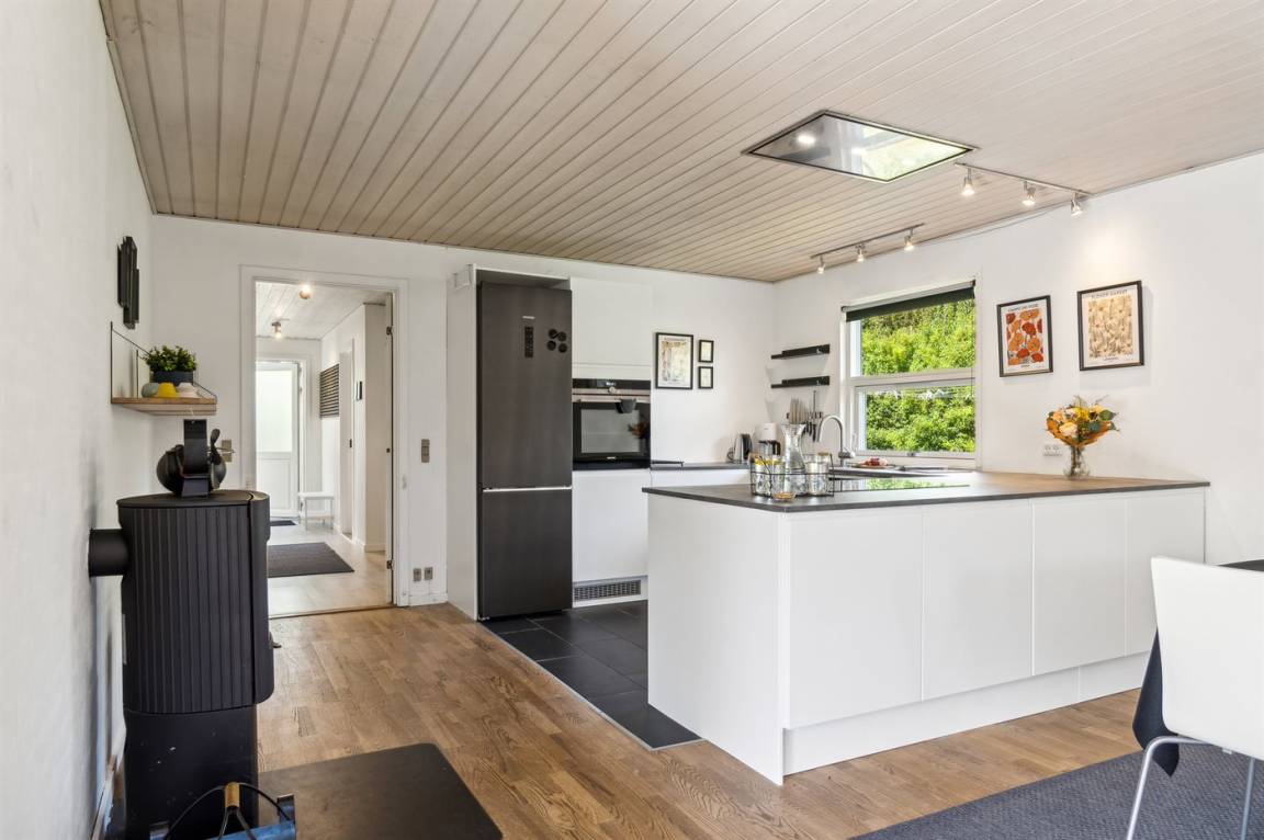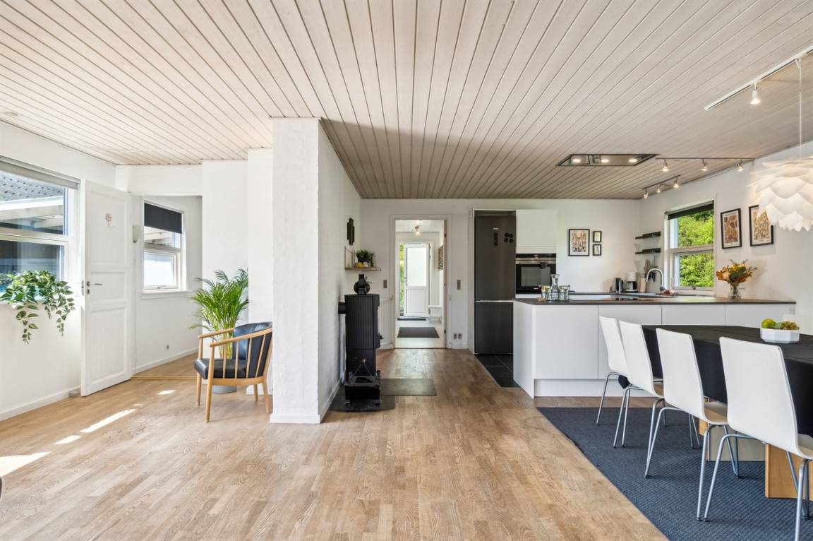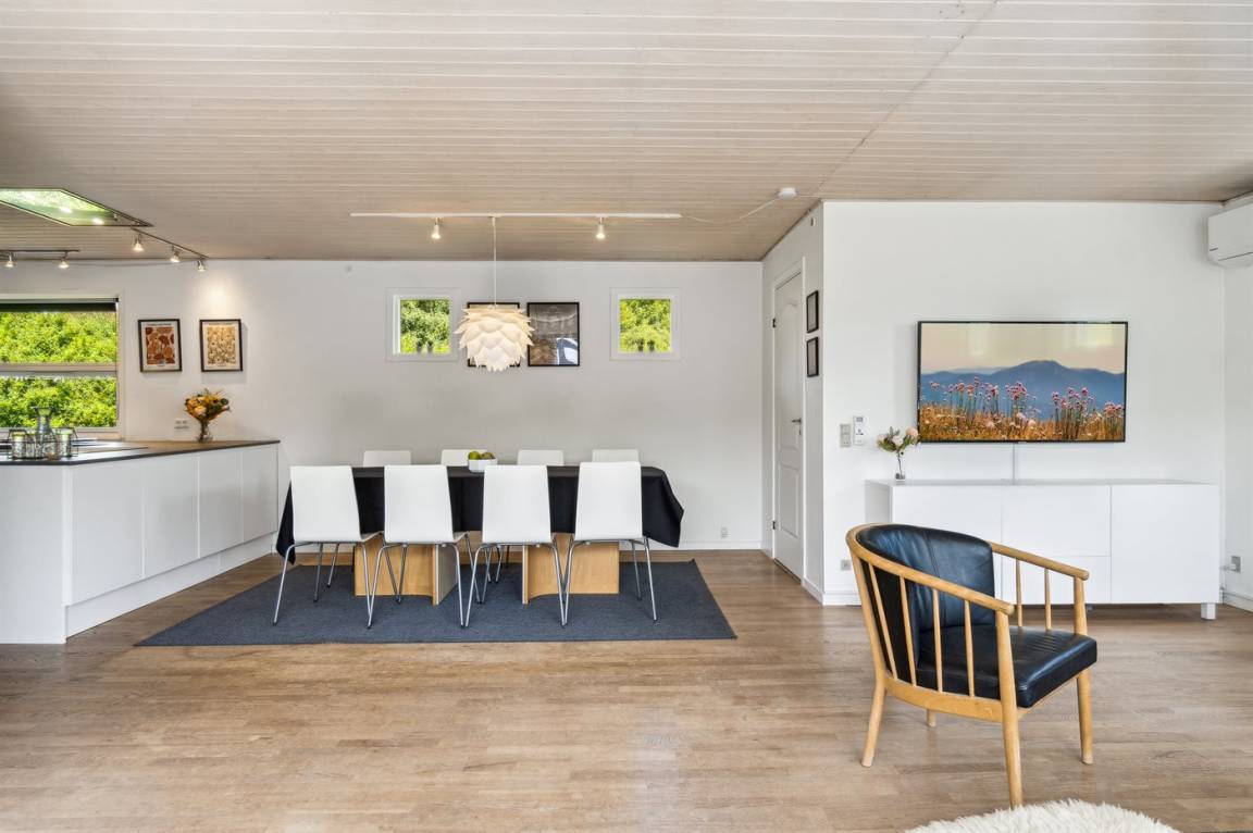 Im naturschönen Boeslum in der Nähe des Stadtzentrums von Ebeltoft liegt dieses schöne Ferienhaus. Das Haus ist gut eingerichtet und es gibt vier geräumige Schlafzimmer und ein gemütliches Gästehaus. Das Wohnzimmer ist hell und geräumig, mit einem großen Fernseher, zu dem ein umfangreiches TV-Paket mit dänischen, skandinavischen und deutschen Fernsehsendern gehört. Es gibt ein ganz neues Badezimmer und eine neue Küche, die in offener Verbindung mit dem Ess- und Wohnzimmer liegt.