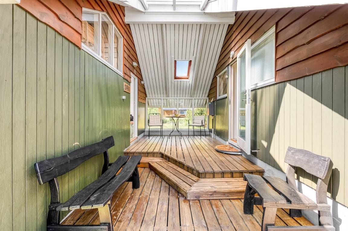 Draußen liegt das Haus auf einem schönen Naturgrundstück mit mehreren gemütlichen Wegen auf dem teilweise bewachsenen Grundstück. Hier gibt es gute Terrassen und eine gemütliche Feuerstelle mitten in der Natur.