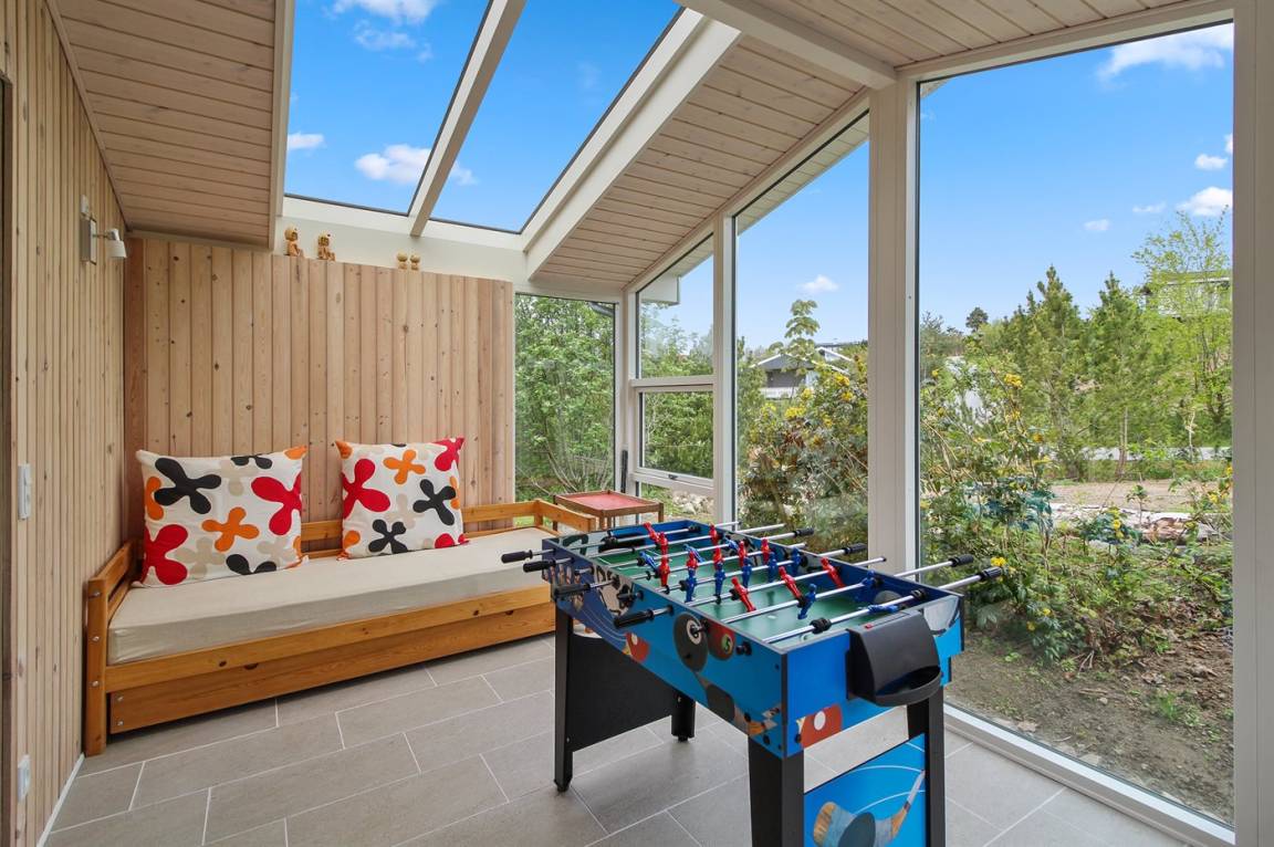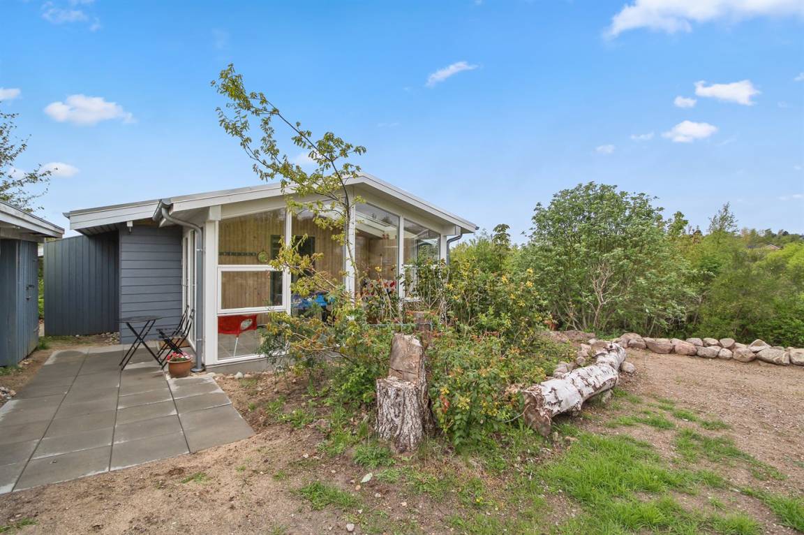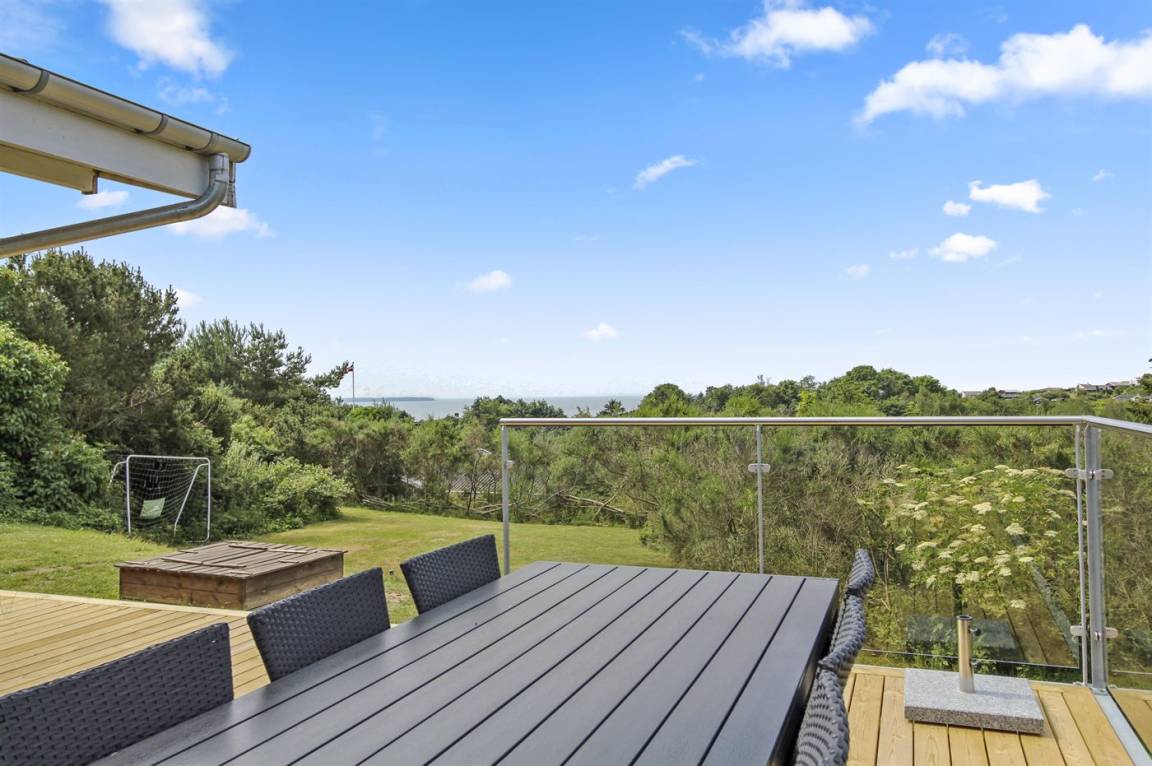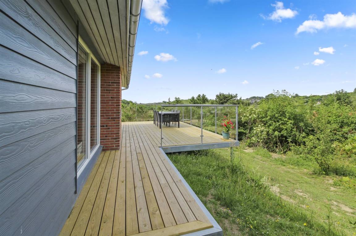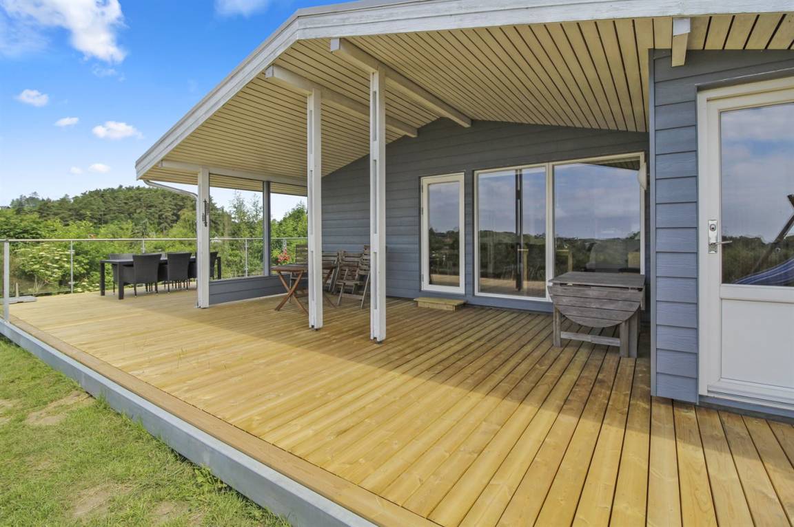 Ein hell eingerichtetes Ferienhaus, das auf einem hügeligen Naturgrundstück liegt. Von der überdachten Terrasse haben Sie eine herrliche Aussicht auf die schöne Natur mit dem Meer im Hintergrund. Das Haus ist 2019 mit einem neuen Eingangsbereich erweitert - der mit einem Multifunktionsspieltisch eingerichtet ist.