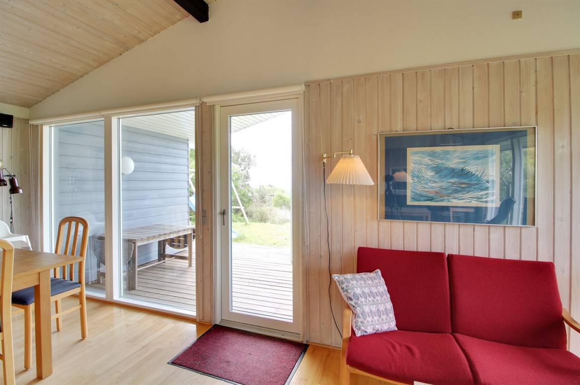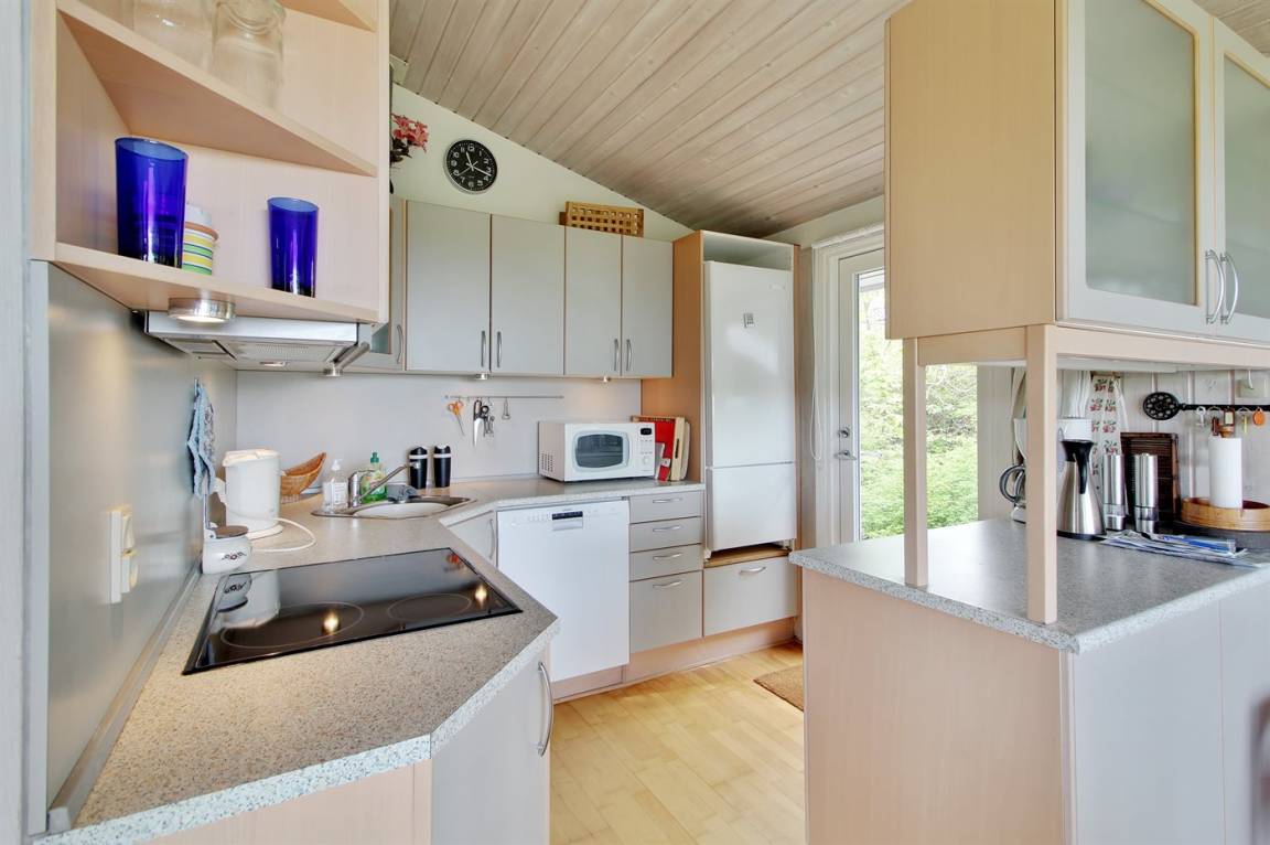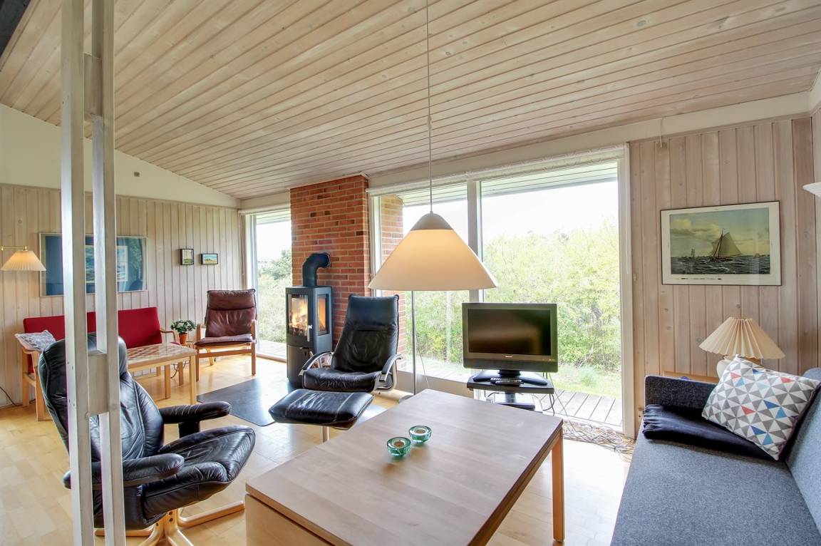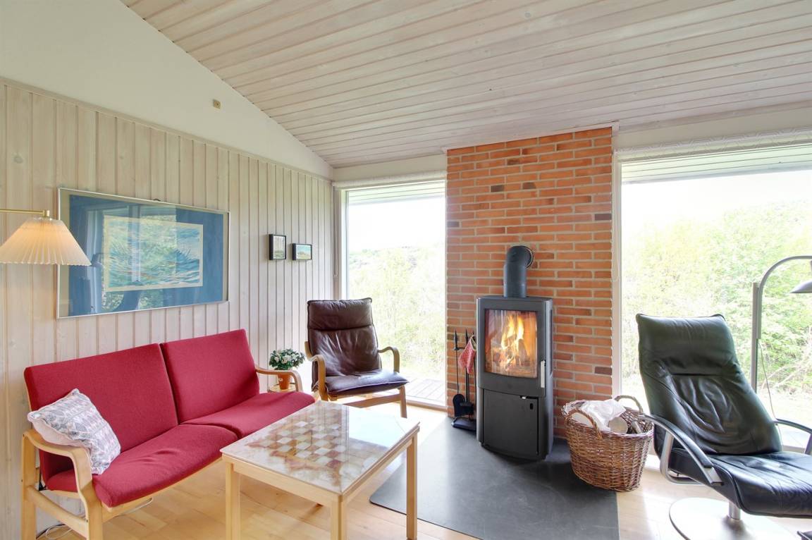 Ein hell eingerichtetes Ferienhaus, das auf einem hügeligen Naturgrundstück liegt. Von der überdachten Terrasse haben Sie eine herrliche Aussicht auf die schöne Natur mit dem Meer im Hintergrund. Das Haus ist 2019 mit einem neuen Eingangsbereich erweitert - der mit einem Multifunktionsspieltisch eingerichtet ist.