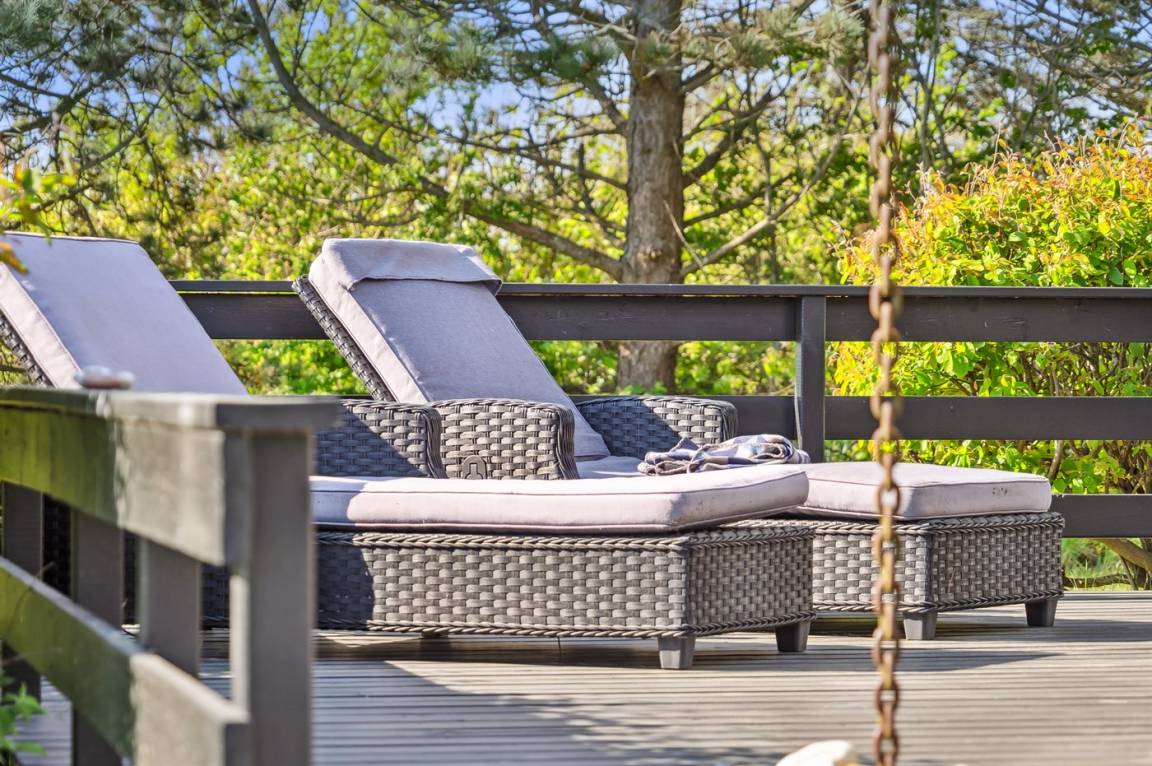 Lehn dich zurück auf das große Sofa des Hauses vor dem Kamin und dem großen Flachbildfernseher oder begeb dich auf die große Terrasse des Hauses, die sich um den größten Teil des Hauses erstreckt, so dass immer ein Platz im Schatten, im Windschutz oder in der Sonne gefunden werden kann.
