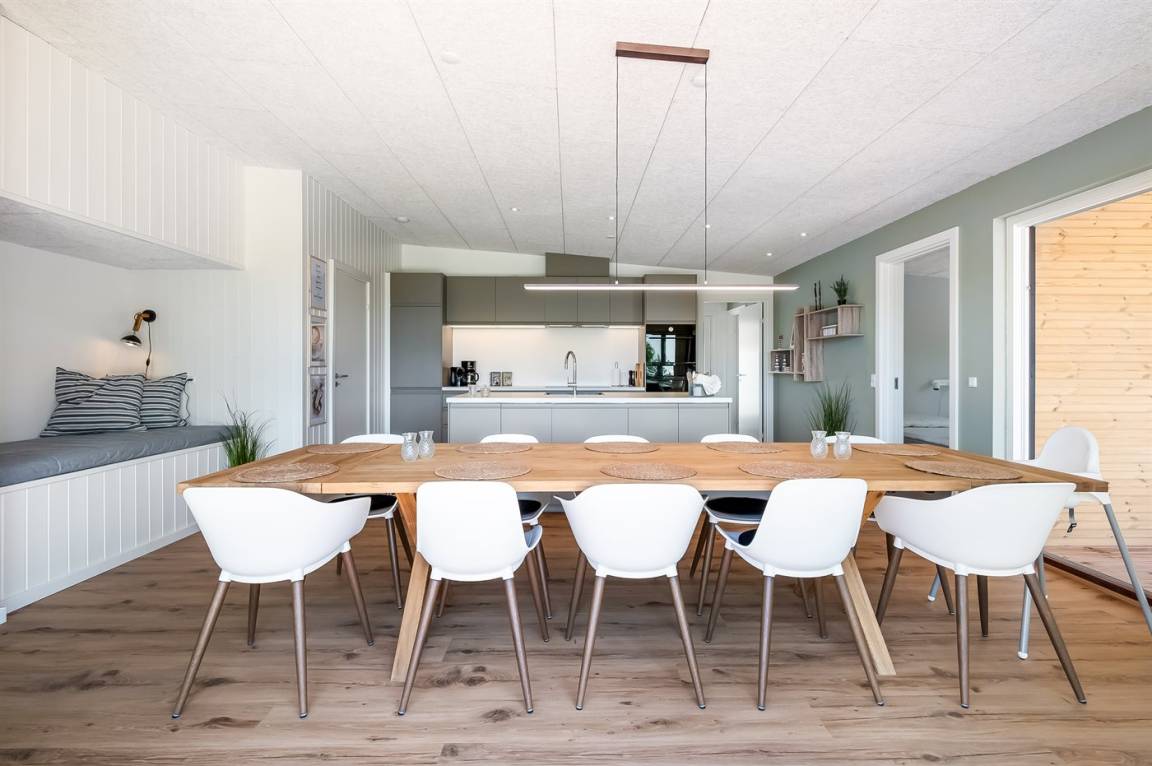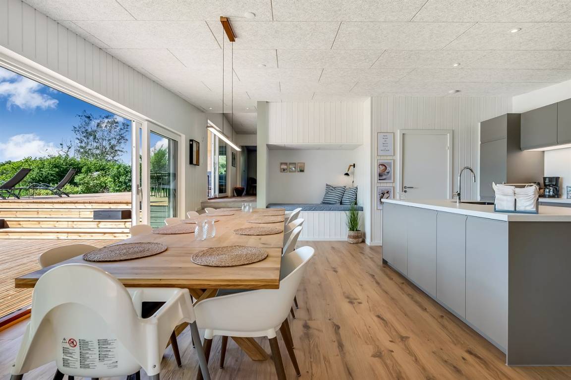 Das Ferienhaus ist perfekt gestaltet – mit einem durchdachten Grundriss, das es für zwei Familien oder für eine Familie, die mit den Großeltern in den Urlaub fährt, ideal macht. Das Herzstück des Hauses ist der großartige Küchen-/Essbereich, von dem aus ein paar Stufen zur gemütlichen Stube führen. Von hier aus kannst du den herrlichen Ausblick auf das Meer und die Umgebung genießen.