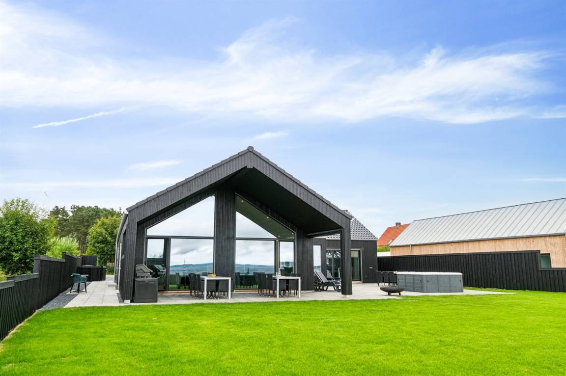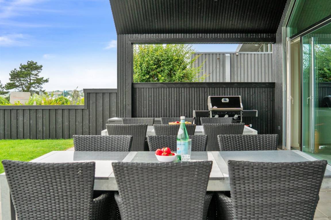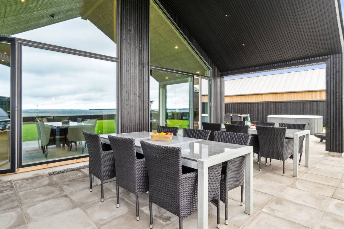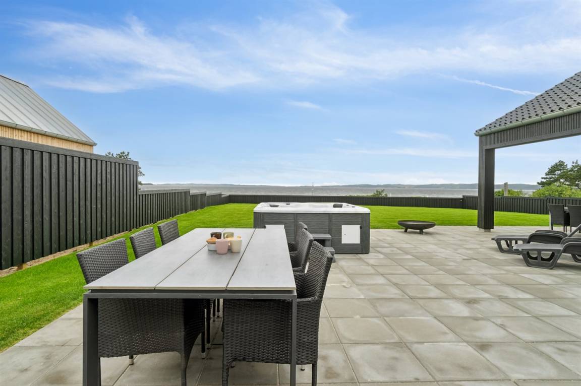 Die große Terrasse des Ferienhauses bietet gute Möglichkeiten für Schutz und Schatten. Auf der Terrasse findest du auch einen großen Whirlpool im Freien, in dem man sich in den sprudelnden Massageblasen zurücklehnen und dabei auf Ebeltoft Vig und das schöne Wasser blicken kann.