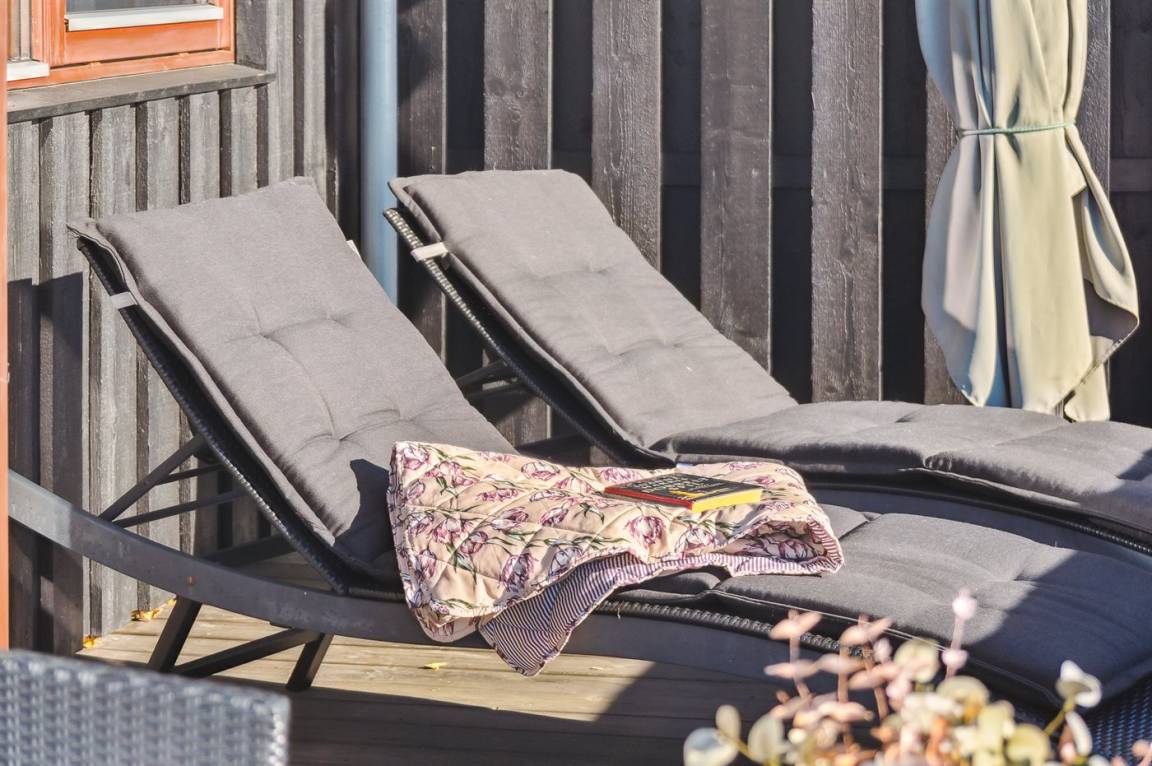 Draußen gibt es eine große, abgeschlossene Terrasse, die sich um das ganze Haus windet. So gibt es immer die Möglichkeit, einen Platz mit Windschutz, Sonne, Schatten oder was man gerade braucht, zu finden – gleichzeitig können Kinder und Hunde draußen spielen, ohne dass man sich Sorgen machen muss, dass sie weglaufen.