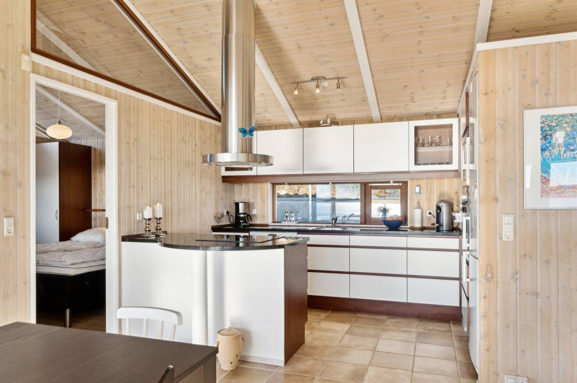 Das Haus verfügt über einer großen Wohnküche mit einer traumhaften Aussicht. Hier kann man sich vor dem Fernseher oder dem Kaminofen versammeln und die Atmosphäre des Ferienhauses genießen.