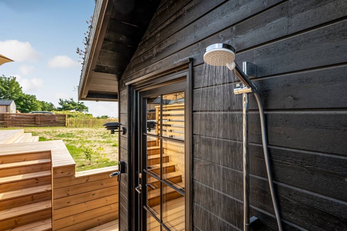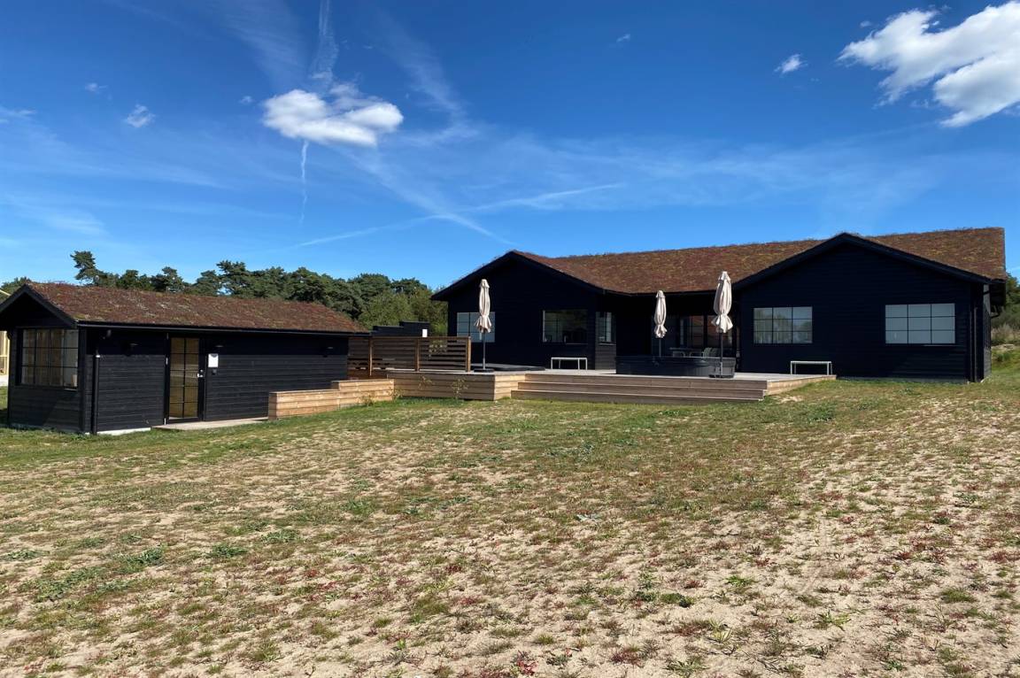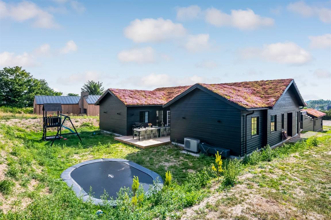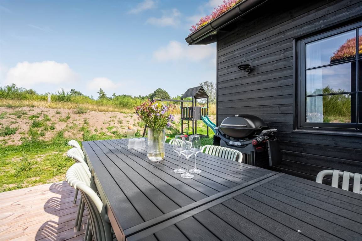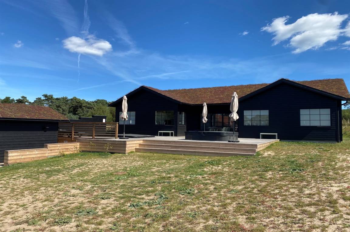 DraußenDie Ferienunterkunft liegt auf einem 1207 m² großen Naturgrundstück. Die Entfernung zum Meer beträgt 650 m. Die nächste Einkaufsmöglichkeit liegt 1500 m entfernt. In einem Abstand von 4000 m gibt es einen Golfplatz. Es steht ein offenes Terrassenareal zur Verfügung. Außerdem gibt es überdachte Terrasse. Schaukel. Sandkasten. Trampolin. Die Entfernung zu einem Spielplatz beträgt 1500 m. Außensauna. Außendusche. Es steht ein Grill zur Verfügung. Es ist ein Ladestecker für Elektroautos installiert. Ladestecker Typ 2. Mit einer Ladeleistung von 11 kW. Parkplatz auf dem Grundstück.