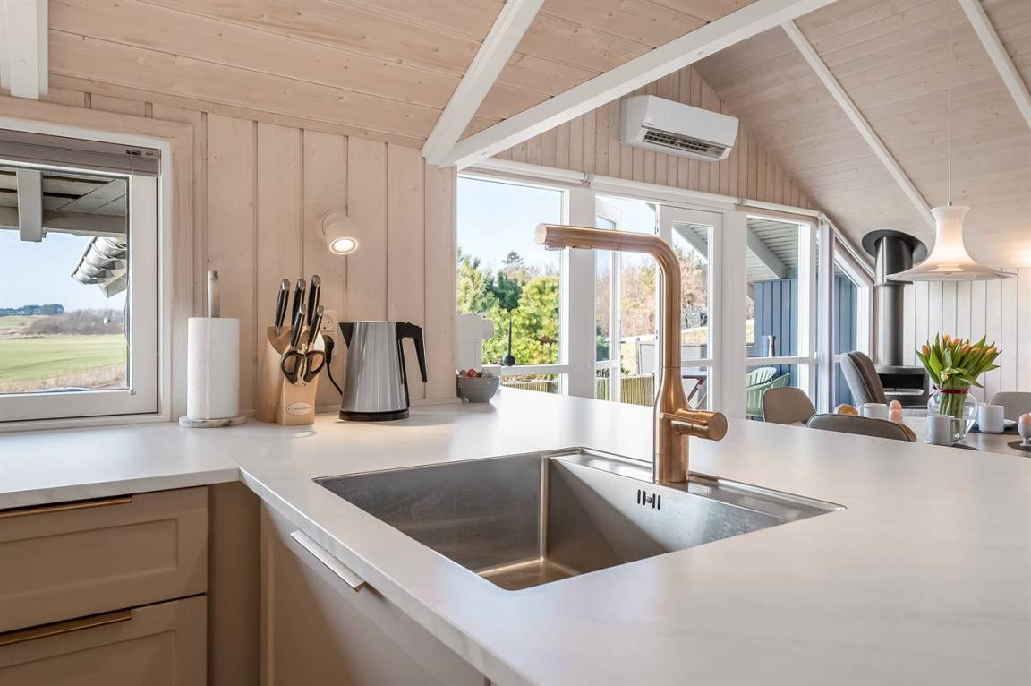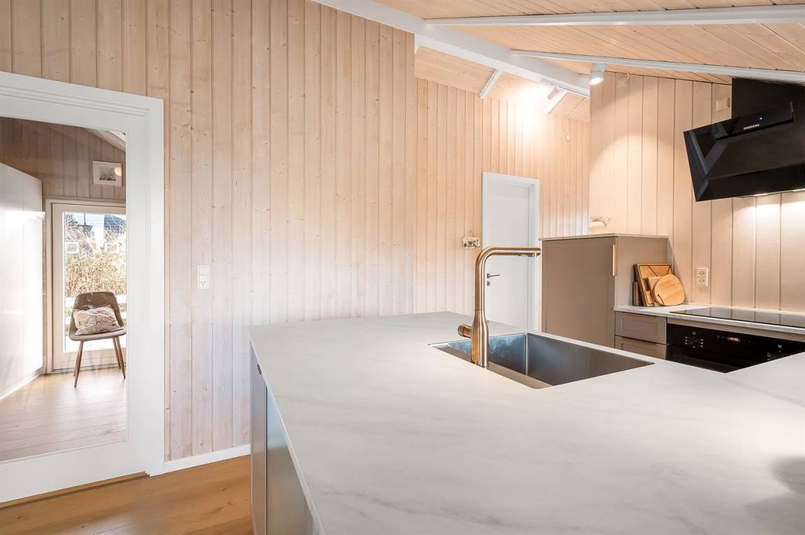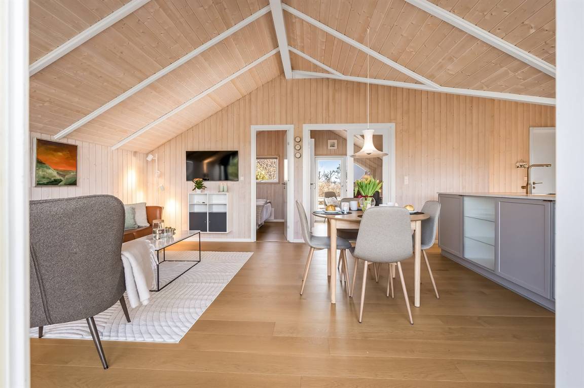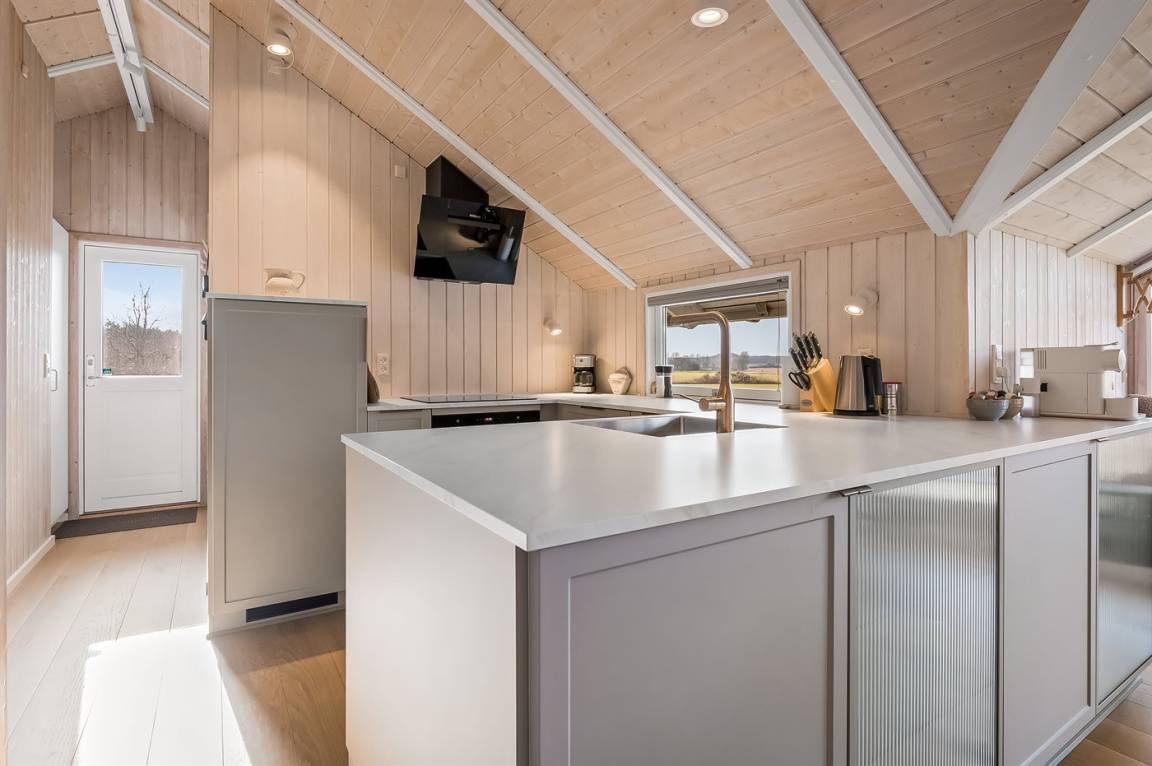 Gemütliches und modernisiertes Ferienhaus mit einer neueren Küche und Möbeln, die zur richtigen Atmosphäre und Gemütlichkeit beitragen.