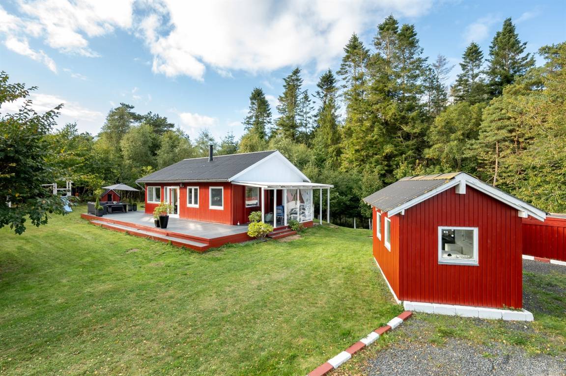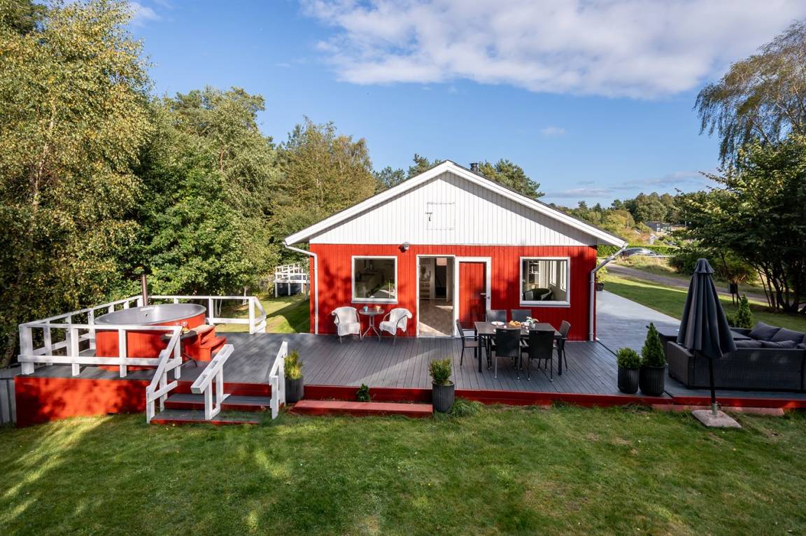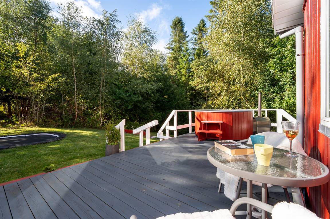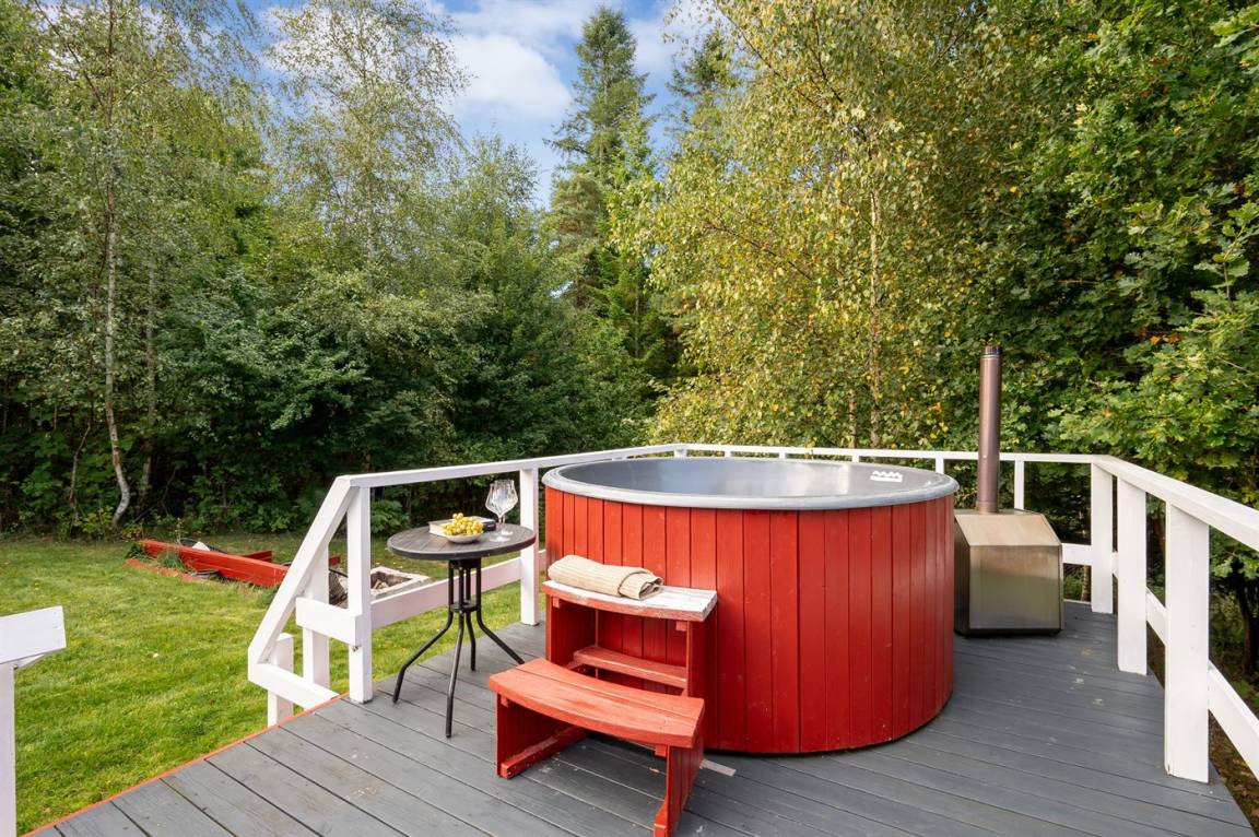 Das Ferienhaus verfügt über einen Eingangsbereich mit zwei Schlafzimmern und Bad/WC. Küche, Esszimmer und das Wohnzimmer mit Kaminofen befinden sich in einem offenen Bereich. Vom Wohnzimmer gelangst du auf die große Terrasse, teils überdacht, teils offen, wo dich einen Hot Tub erwartet, umgeben vom grünen Wald dahinter.