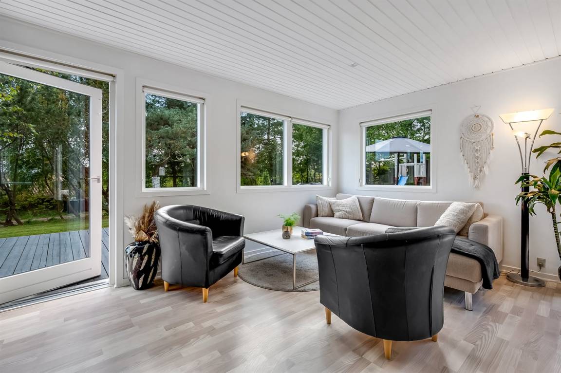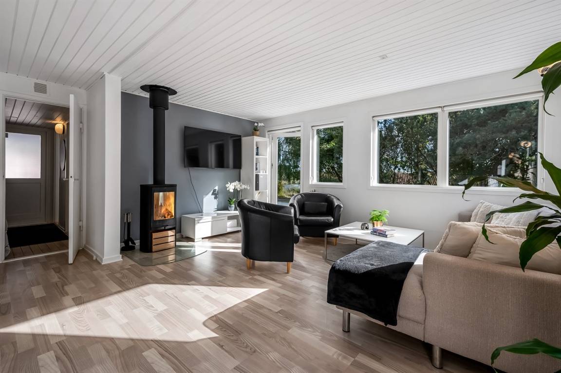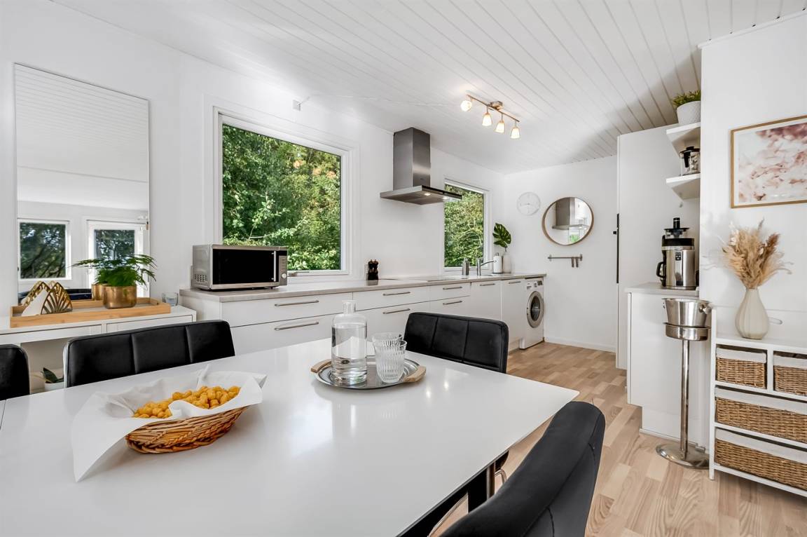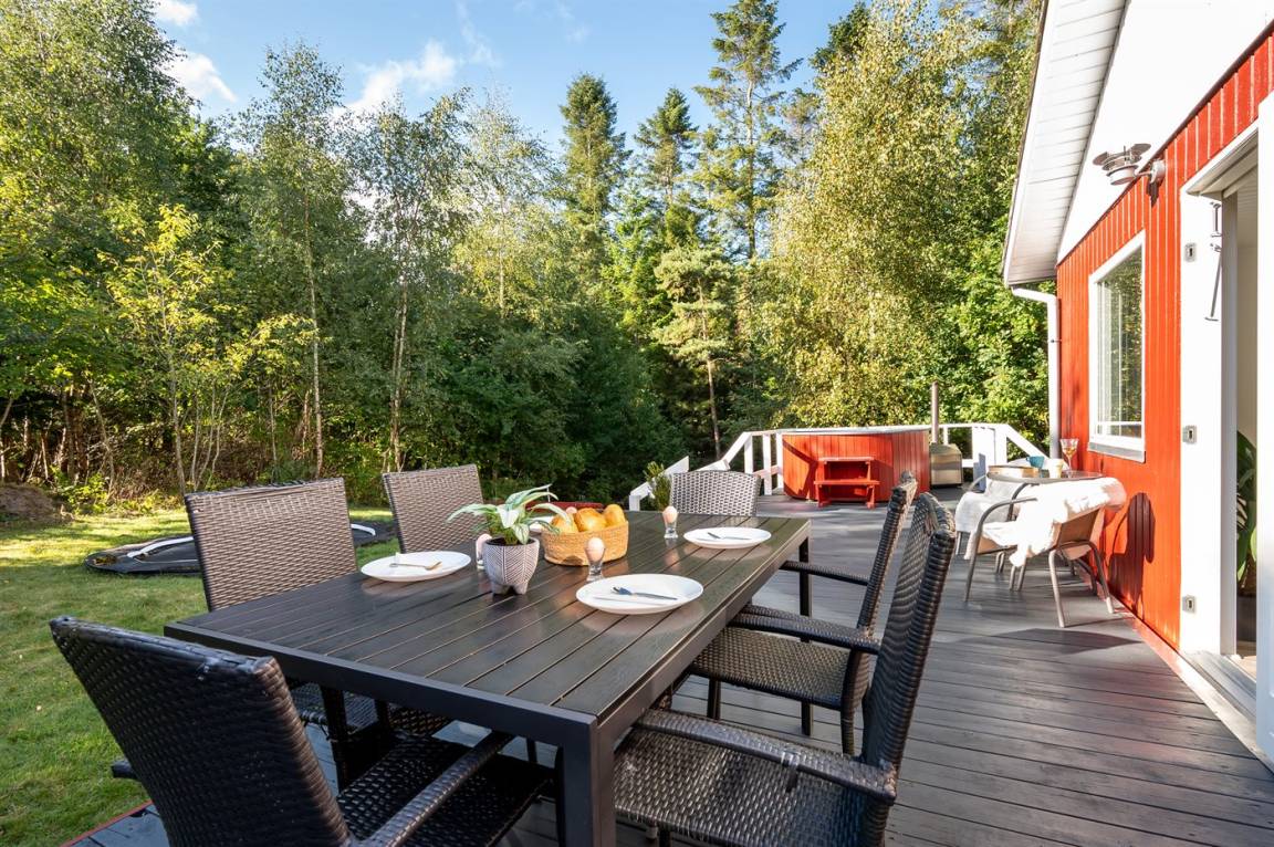 Das Ferienhaus verfügt über einen Eingangsbereich mit zwei Schlafzimmern und Bad/WC. Küche, Esszimmer und das Wohnzimmer mit Kaminofen befinden sich in einem offenen Bereich. Vom Wohnzimmer gelangst du auf die große Terrasse, teils überdacht, teils offen, wo dich einen Hot Tub erwartet, umgeben vom grünen Wald dahinter.