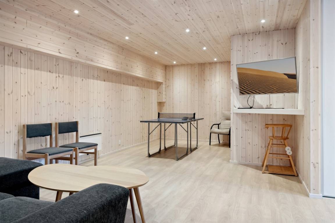 Innen tritt das Haus äußerst modern hervor mit einer großen und offenen Wohnküche, die mit dem Wohnzimmer kombiniert ist. Außerdem gibt es einen großen Aktivitätsraum mit z.B. Tischtennis, wo Kinder oder die ganze Familie sich gegenseitig herausfordern können.