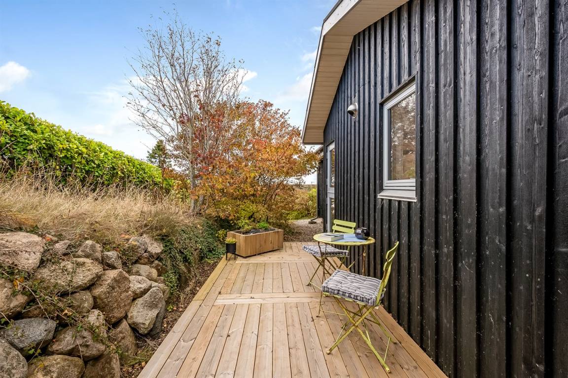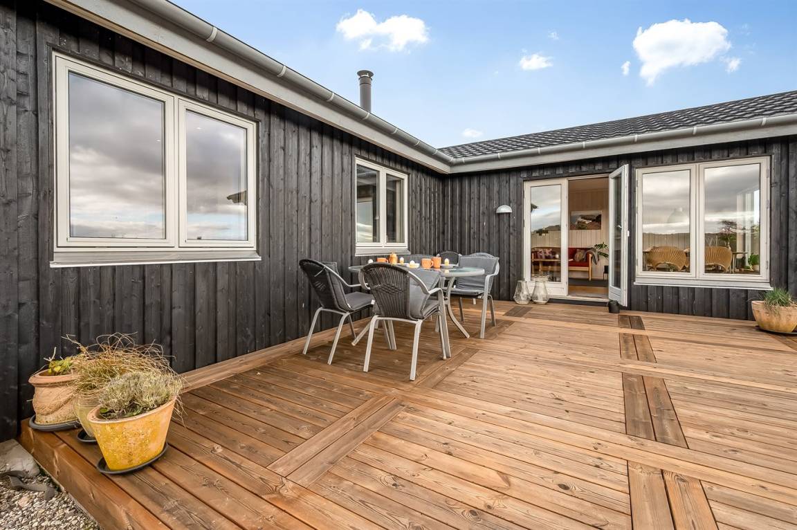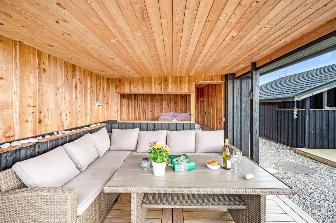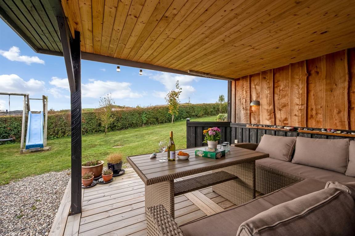 Außerdem bietet das Ferienhaus ausgezeichnete Terrassenflächen an mehreren Seiten des Hauses, sodass du immer die Sonne genießen und einen windgeschützten Platz finden kannst, wenn das Wetter einmal nicht ganz mitspielt. Eine der Terrassen ist überdacht, und hier findest du außerdem ein große, geräumige Windschutzhütte mit Platz für die ganze Familie, wenn ihr unter freiem Himmel schlafen möchtet.
