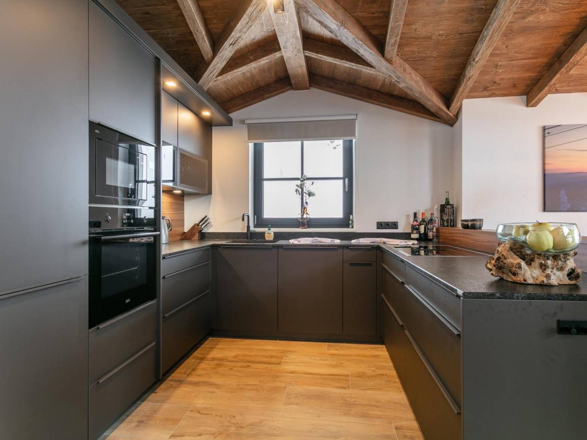 In der 2. Etage: offene Küche mit Wasserkocher, Kochendwasserhahn, Toaster, Dunstabzugshaube, Kaffeemaschine(Filter, nespresso cups), Backofen, Grill, Mikrowelle, Geschirrspüler, Kühlschrank, Tiefkühlschrank , Wohn/Esszimmer mit TV, Esstisch(8 Personen), Sitzecke(8 Personen), kabelloses Musiksystem , Balkon