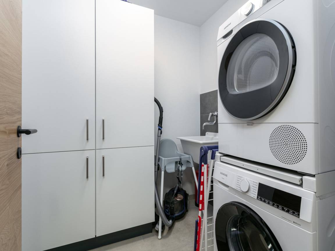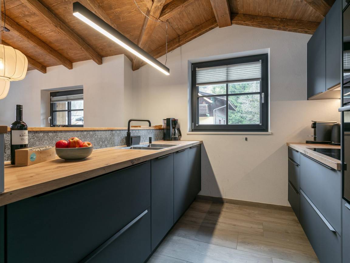 In der 1. Etage: offene Küche mit Wasserkocher, Kochendwasserhahn, Dunstabzugshaube, Kaffeemaschine(Filter, nespresso cups), Backofen, Mikrowelle, Geschirrspüler, Kühlschrank, Tiefkühlschrank , Wohn/Esszimmer mit TV, Esstisch(10 Personen), Sitzecke(8 Personen) , Schlafzimmer mit Badezimmer mit Doppelbett(180 x 210 cm), TV, Dusche, Waschbecken, Toilette, Föhn , Balkon
