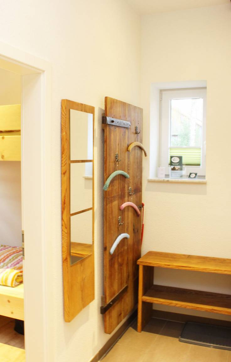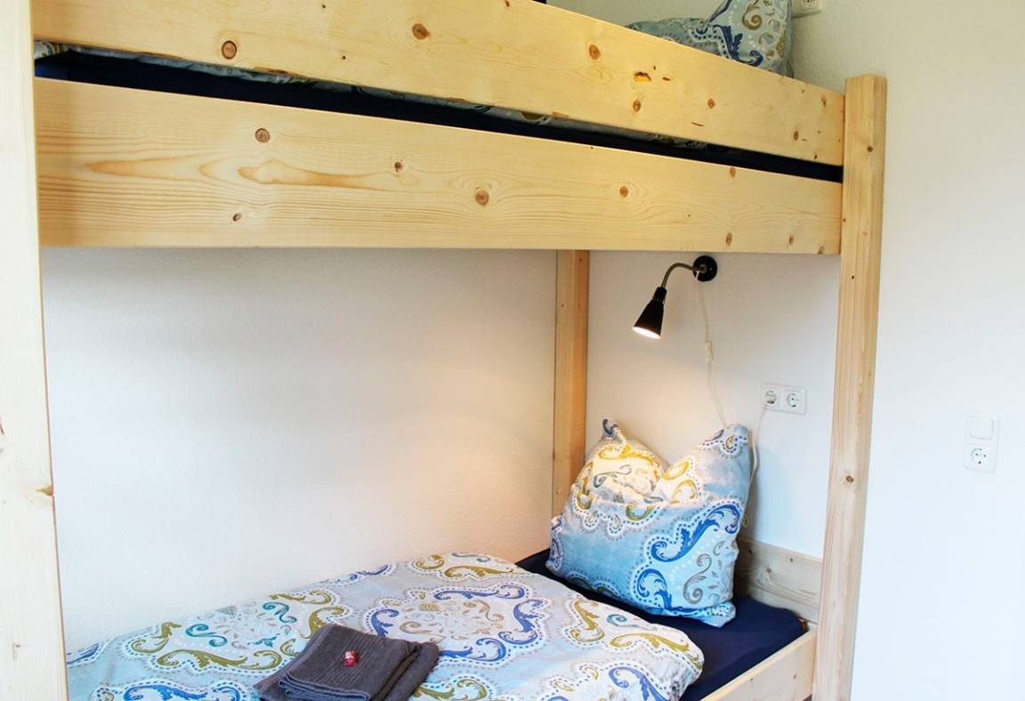 Alle Zimmer befinden sich im Erdgeschoss. Neben dem großzügigen Wohnzimmer mit Essecke und offener Küche gibt es 2 Schlafzimmer und ein modernes Bad (Dusche/WC) mit Fußbodenheizung. Ein Schlafzimmer verfügt über ein Doppelbett, das andere über ein sehr stabiles, vom Zimmermann gebautes Hochbett, das Kinder wie Erwachsene gut verträgt.