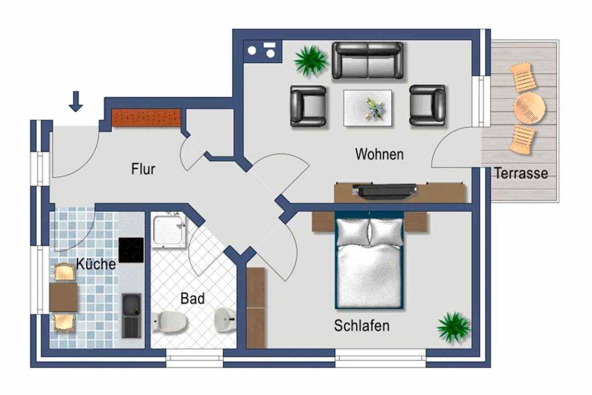 Die im Erdgeschoss gelegene Wohnung ist barrierefrei, bietet Platz für 2 Personen und ist komfortabel ausgestattet. Neben dem Schlafzimmer mit Doppelbett, der modernen Einbauküche mit Esstisch und dem hellen Duschbad steht das gemütliche Wohnzimmer mit direktem Terrassenzugang zur Verfügung.