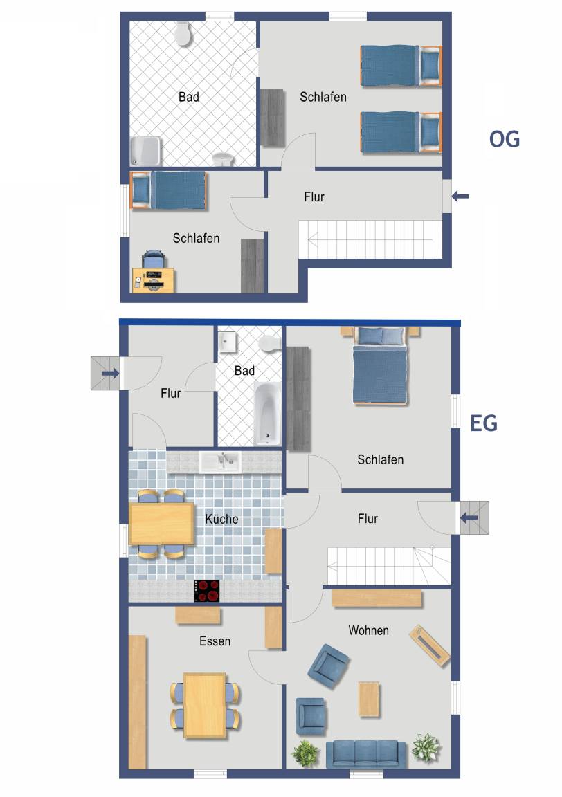 Die Ferienwohnung Haus Gerda verfügt auf rund 100qm über 2 Schlafzimmer und ein Bad im OG sowie ein weiteres Schlafzimmer, Wohnzimmer, separates Esszimmer, große Küche und Bad im EG.