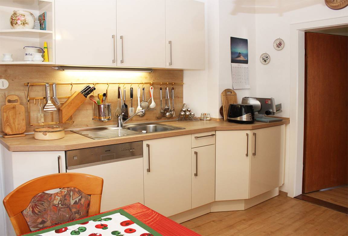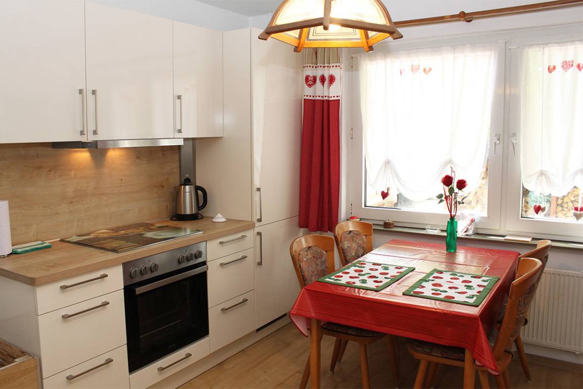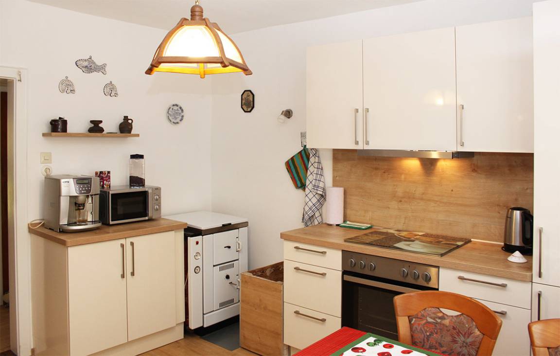 In der neuen und modernen Einbauküche mit Essecke können Sie gemütlich kochen und gemeinsam Essen.
