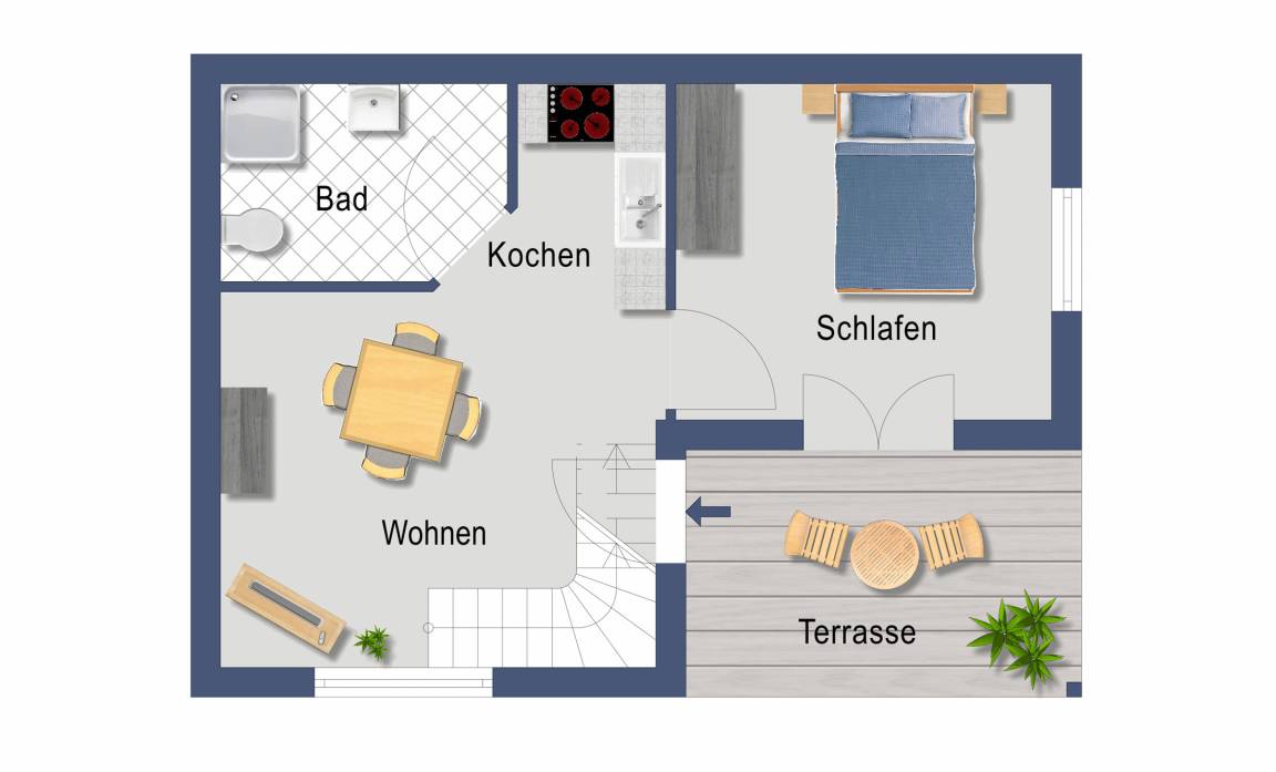Das skandinavisch anmutende Holz-Ferienhaus "Kartoffeldoktors Häuschen" bietet im Erdgeschoss einen Wohn-Ess-Bereich, eine kleine, sehr gut ausgestattete Küche, ein Bad DU/WC sowie ein Schlafzimmer mit Doppelbett.