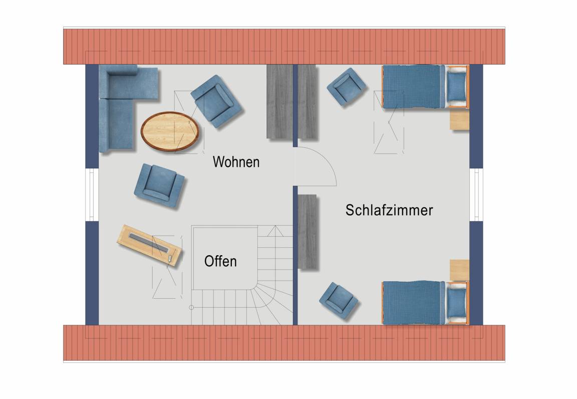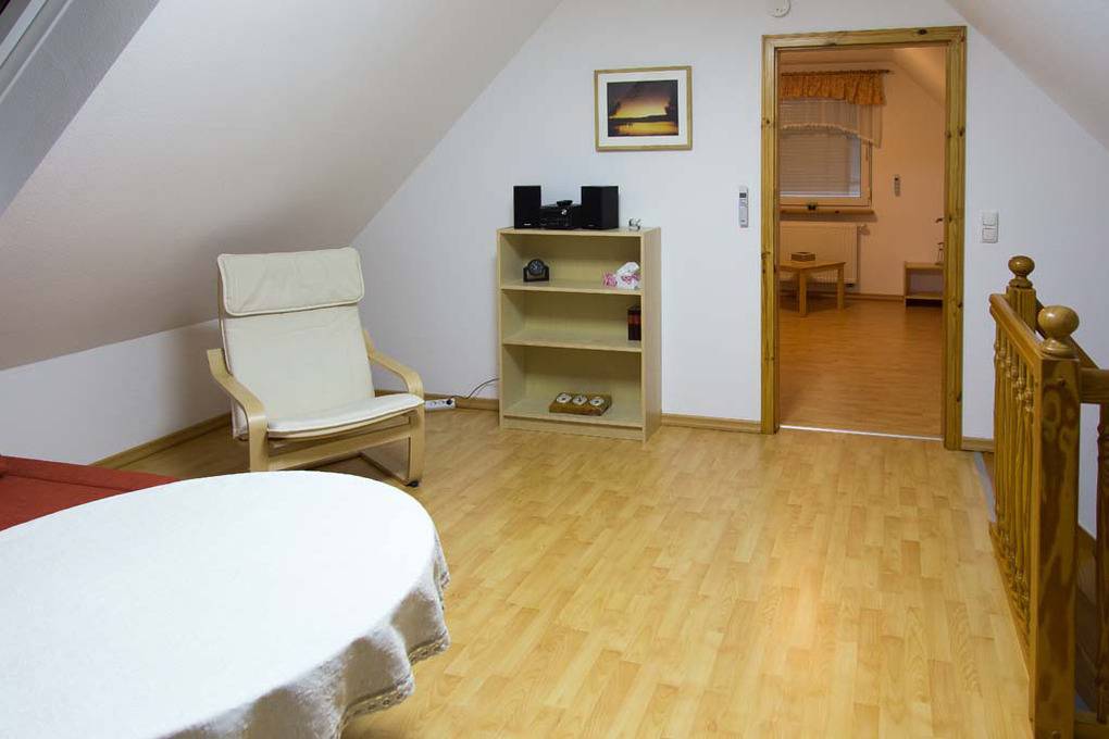 Im Obergeschoss kann man es sich im Wohnbereich auf dem Sofa gemütlich machen, fernsehen, lesen, Musik hören, spielen oder einfach klönen. Im Schlafzimmer stehen zwei Einzelbetten.