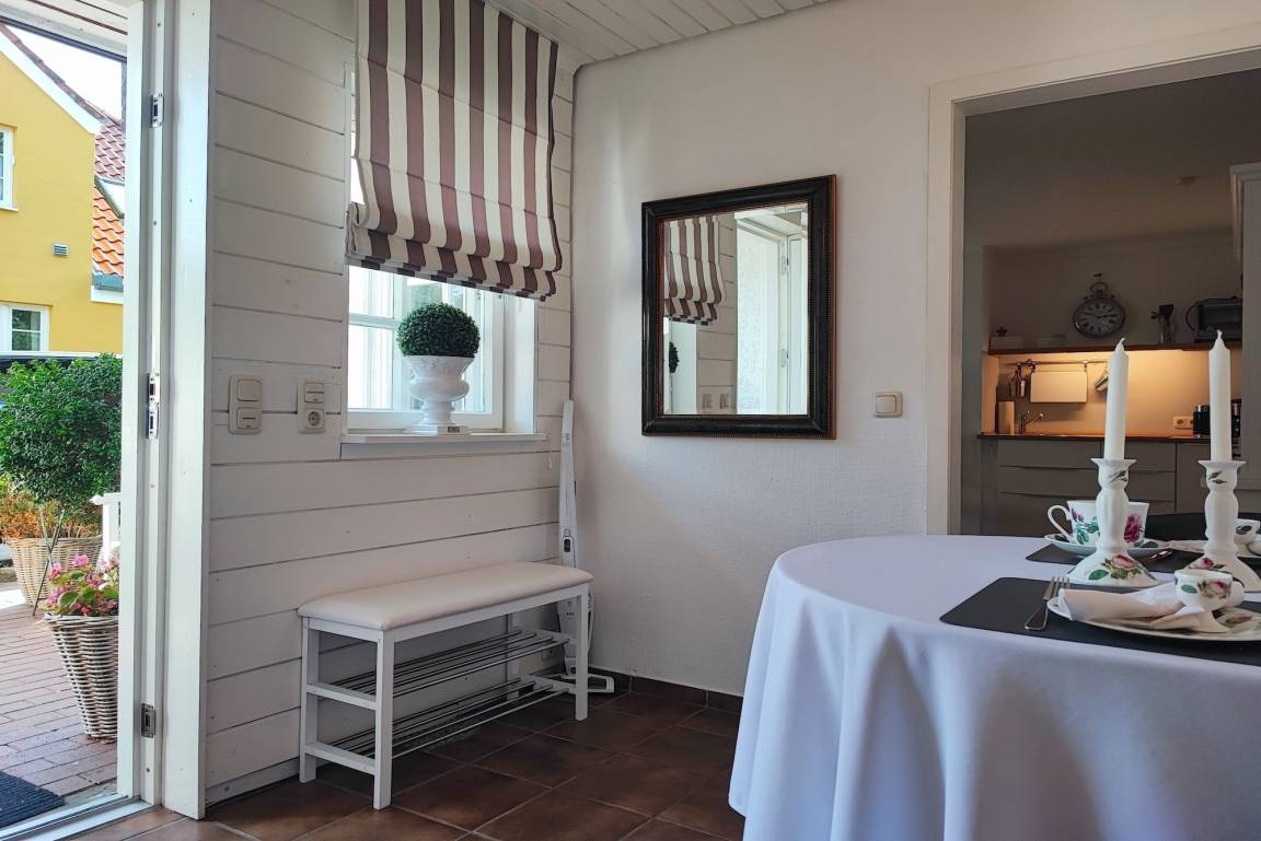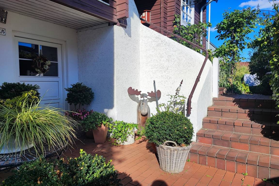 Ihnen steht ein kleiner Bauerngarten mit Strandkorb zur Verfügung in dem sie Frühstücken, oder sich ausruhen können. Die Nichtraucher-Ferienwohnung liegt im Erdgeschoss eines Einfamilienhauses im Stadtteil Alt Borby. Nur wenige Schritte entfernt zur Aussichtsplattform, schaut man auf die Eckernförder Bucht und die Stadt Eckernförde. Stadt, Strand, Restaurant und Geschäfte, Einkaufsmöglichkeiten sind zu Fuß zu erreichen. Parkmöglichkeiten sind wenige Schritte auf einem Parkplatz vorhanden. Ausladen kann direkt vor dem Haus erfolgen. Fahhradunterstellmöglichkeit ist ebenfalls gegeben.