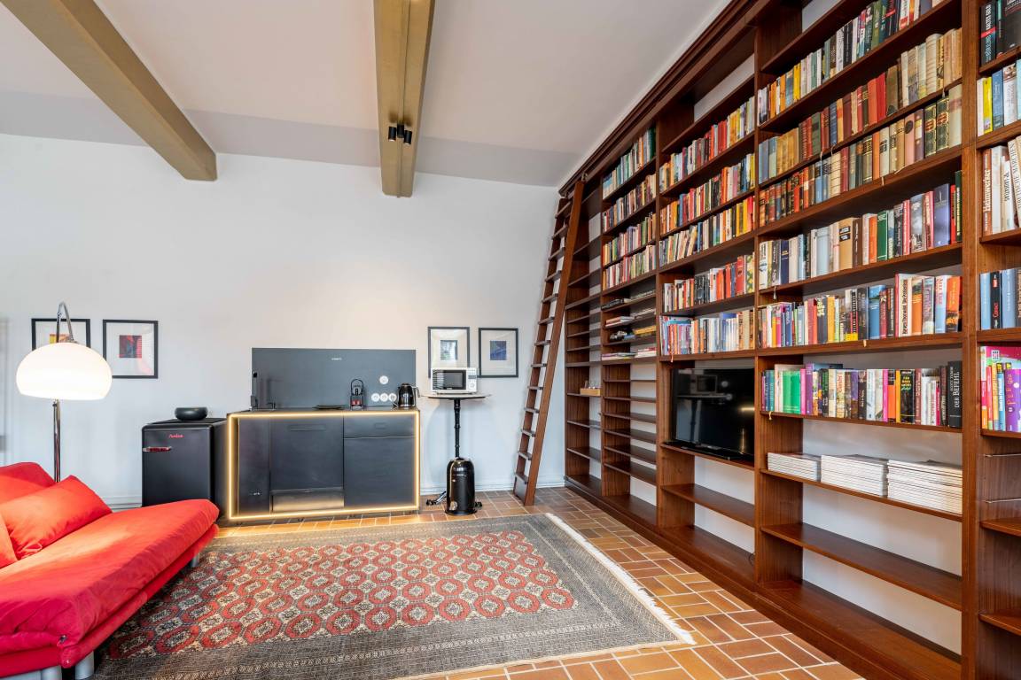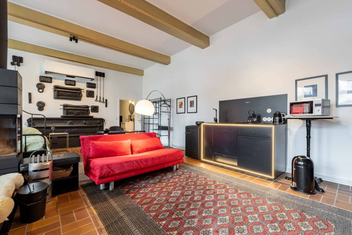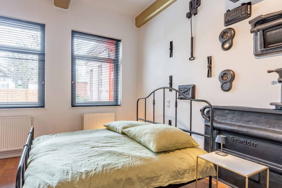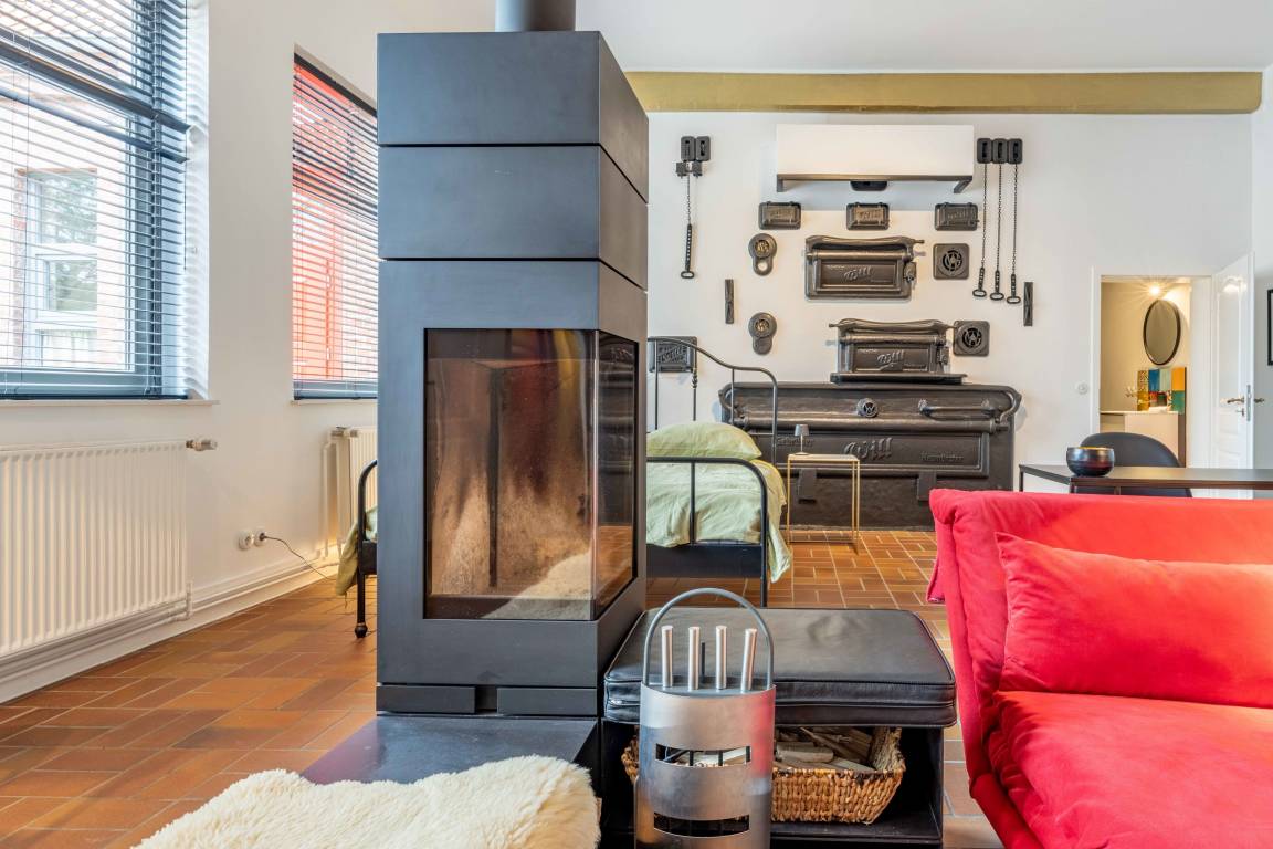 Genießen Sie die Besonderheit eines Industrie-Lofts in der Ferienwohnung Landbäckerei 2. Hohe Decken und ein musealer Dampfbackofen aus Gusseisen.