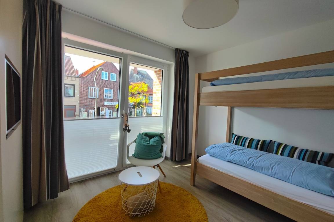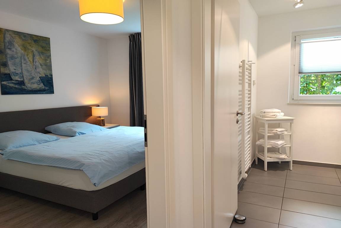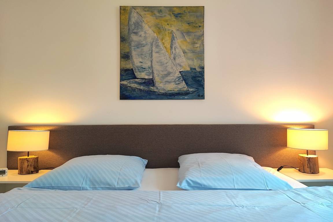 Die Wohnung ist aufgrund der Ausstattung und Einrichtung für Familien bis 5 Personen mit einem Kleinkind, als auch ideal zum Wohlfühlen für ein Paar. Der offene Wohnbereich bietet eine große Vielfalt an Möglichkeiten, vom großem Esstisch, über den bequemen Wohnbereich zum lesen und Fernsehen bis hin zur Küche mit fließendem Übergang. Das Wohnzimmer verfügt über ein Sofa mit Schlaffunktion. Die Ferienwohnung mit separatem Hauseingang verfügt über eine am Nachmittag sonnige Veranda zur Hafenseite hin und über eine geschüzte Innenhofterrasse für die besonders heißen Tage. Die hochwertige und voll ausgestattete Küche bietet alles was Sie zum Zubereiten von Mahlzeiten und zum Kochen benötigen. In der Küche gibt es einen weiteren Essbereich mit 4 Stühlen und ermöglicht den Zugang zur Innenhof-Terrasse. Die nächtliche Erholung finden Sie in den zwei Schlafzimmer mit je einem TV-Gerät und je einem Kleiderschrank ausgestattet. Das Hauptschlafzimmer hat ein modernes Doppelbett, somit kann bei Bedarf dieses als Einzelbetten auseinandergeschoben werden. Im zweiten Schlafzimmer befindet sich ein Etagenbett, ein Favorit für Kinder. Größe der vier Matratzen, jeweils 90x200. Beide Schlafzimmer verfügen über Plissees und zusätzliche Verdunklung durch blickdichte Gardinen. Das Duschbad ist mit Bodenfliesen und Fußbodenheizung ausgestattet. Die Dusche ist ebenerdig. Das Bad bietet Geräumigkeit und Abstellflächen. Die im Hochperterre des Appartementhauses gelegene Ferienwohnung kann ''barrierefrei'' über einen Aufzug, mit direktem Zugang aus der Tiefgarage erreicht werden. Die Symbole vom Wohngrundriss können in der Darstellung von der tatsächlichen Innen- und Außengestaltung der Wohnung abweichen!