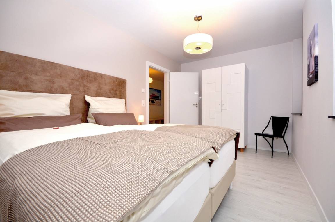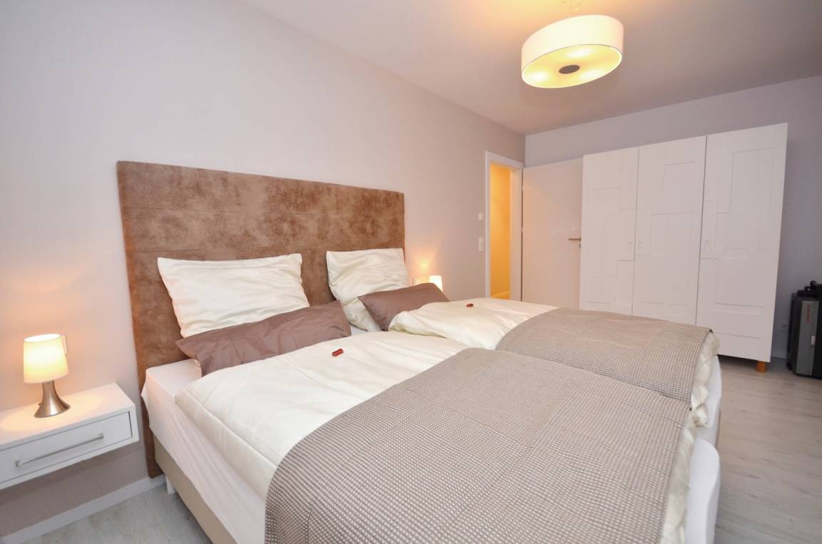 Darüber hinaus stehen Ihnen zwei ruhige Schlafzimmer mit großen, komfortablen Boxspringbetten und extra großen Bettdecken zur Verfügung. Das geräumige Badezimmer mit Dusche und Badewanne lädt zur Entspannung ein. Neben einem WC im Bad verfügt die Wohnung auch noch über ein Gäste-WC. In einem weiteren kleinen Raum steht eine Waschmaschine und Abstellfläche bereit. Alle Zimmer sind mit einer Fußbodenheizung versehen. Selbst der Boden in der bodentiefen Dusche ist mit einer Heizung ausgestattet.