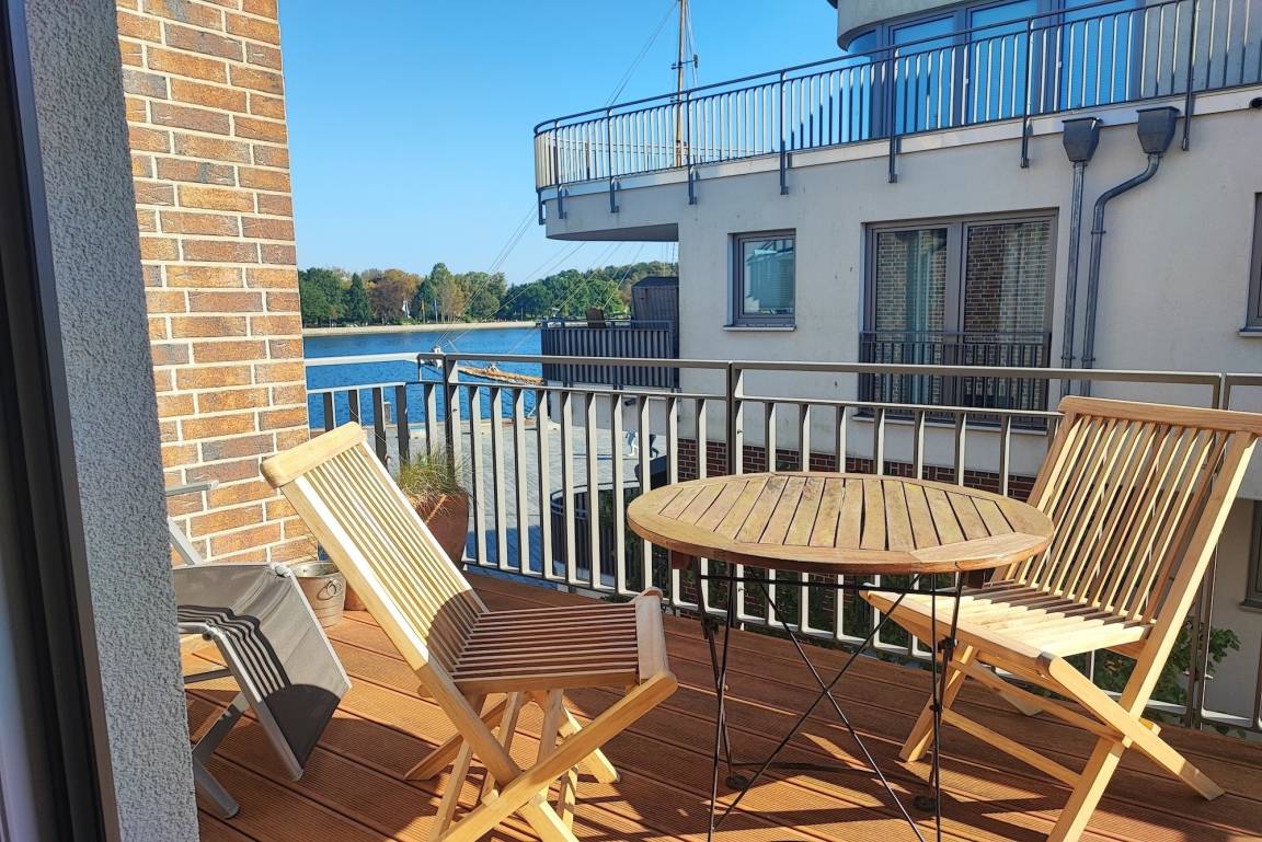 Der offene, kleine aber feine Wohn- und Essbereich, mit voll ausgestatteter Küche, lädt zum gemeinsamen Entspannen und Kochen ein! Die Ferienwohnung verfügt über einen Balkon mit Blick auf das Hafenbecken. Das Schlafzimmer wurde mit einem modernen Boxspringbett (180x200) und einem Kleiderschrank ausgestattet und bietet somit die gewünschte nächtliche Erholung! Das Badezimmer On-Suite ist mit ebenerdiger Dusche. Die komplette Wohnung ist mit Echtholzfußboden und Fußbodenheizung ausgestattet. Die im 1. Stock des Appartementhauses gelegene Ferienwohnung kann ''barrierefrei'' über einen Aufzug, mit direktem Zugang aus der Tiefgarage erreicht werden. Die Symbole vom Wohngrundriss können in der Darstellung von der tatsächlichen Innen- und Außengestaltung der Wohnung abweichen!