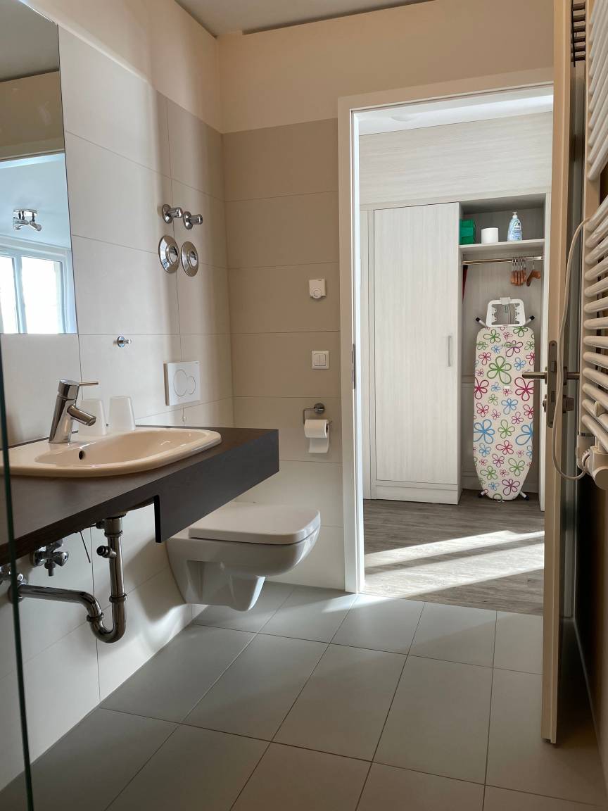? Das Apartmenthaus Hafenspitze verfügt über einen Fahrstuhl sowie einen Waschraum mit Waschmaschinen und Trocknern