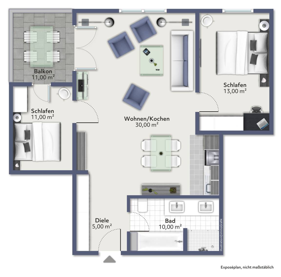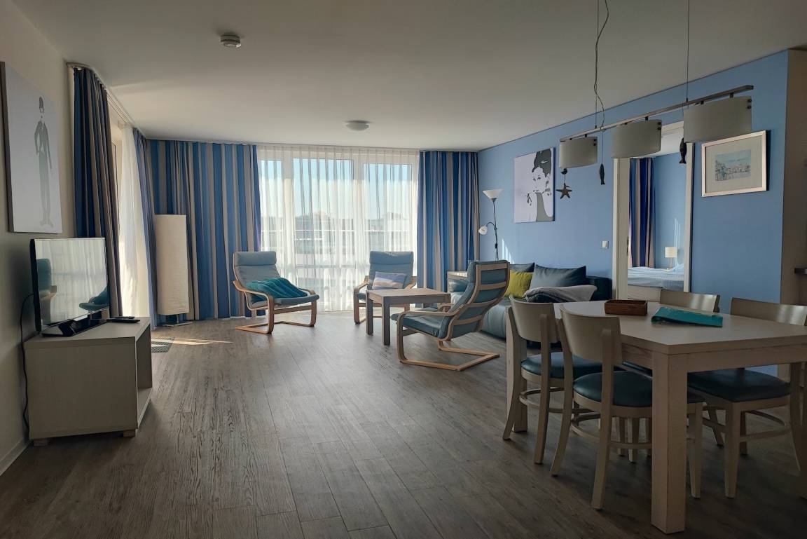 Der modern eingerichtete, offene Wohn- und Essbereich mit voll ausgestatteter Küche, lädt zum gemeinsamen Entspannen und Kochen ein. Der Wohnbereich verfügt über ein Schlafsofa, mit Bettfunktion und Bettkasten sowie drei Schwingsesseln zum gemütlichen abendlichen Zusammensein. Die Ferienwohnung verfügt über einen Balkon mit wunderschönem Blick auf den Strand und Hafen, über den Leuchtturm hinweg weit in die Eckernförde Bucht. Beide Schlafzimmer wurden mit je zwei Einzelbetten (2x90x200), und einem Kleiderschrank ausgestattet, eines verfügt auch über ein TV-Gerät und Schreibtisch. Vom anderen Schlafzimmer haben Sie einen direkten Zugang zum Balkon. Anschaffungsdatum der neuen Betten: 01.2025. Die Dusche im Badezimmer ist ebenerdig und eine Badewanne lädt zur Entspannung ein. Die komplette Wohnung ist mit Vinylboden und Fußbodenheizung ausgestattet. Die im 3. Deck des Appartementhauses gelegene Ferienwohnung kann über das Treppenhaus oder einem Aufzug erreicht werden. Die Symbole vom Wohngrundriss können in der Darstellung von der tatsächlichen Innen- und Außengestaltung der Wohnung abweichen!