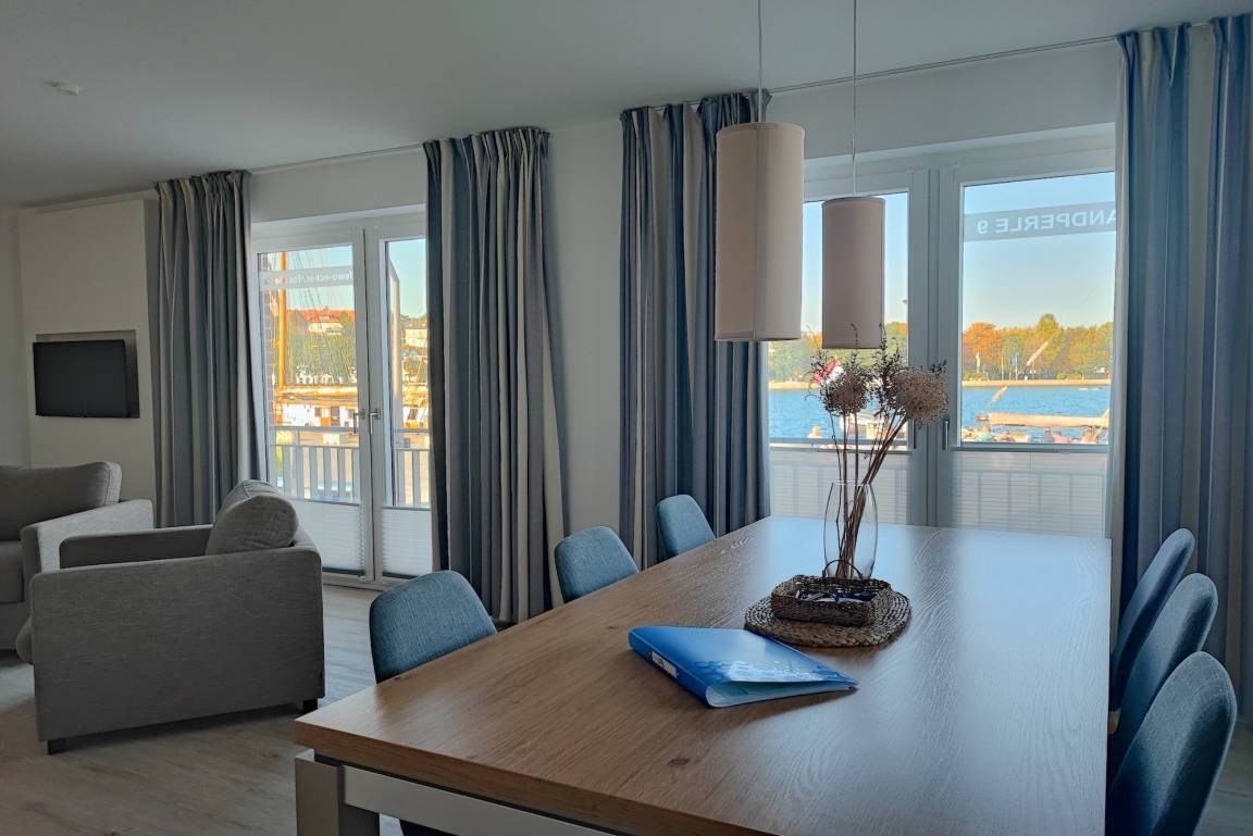 Genießen Sie durch die bodentiefen Fenster oder vom Balkon aus, den weiten Blick über die Hafenpromenade mit Wasserblick. Der stilvoll maritim eingerichtete Wohn- und Essbereich, mit voll ausgestatteter Küche, lädt zum gemeinsamen Entspannen und Kochen ein! Die Ferienwohnung verfügt über eine Terrasse mit wunderschönem Blick über das Hafenbecken. Ein Schlafzimmer wurde mit einem modernen Boxspringbett (180x200) und einem Kleiderschrank ausgestattet. Im zweiten Schlafzimmer befinden sich ein zwei zusammenstellbare Einzelbetten (90x200), ein Kleiderschrank und ein TV-Gerät. Die Schlafzimmer bieten somit die gewünschte Erholung! Die Dusche im Badezimmer ist ebenerdig und eine Badewanne in einem weiteren Badezimmer lädt zur Entspannung ein. Die komplette Wohnung ist mit Vinylboden und Fußbodenheizung ausgestattet. Die im Hochperterre des Appartementhauses gelegene Ferienwohnung kann ''barrierefrei'' über einen Aufzug, mit direktem Zugang aus der Tiefgarage erreicht werden. Die Symbole vom Wohngrundriss können in der Darstellung von der tatsächlichen Innen- und Außengestaltung der Wohnung abweichen!