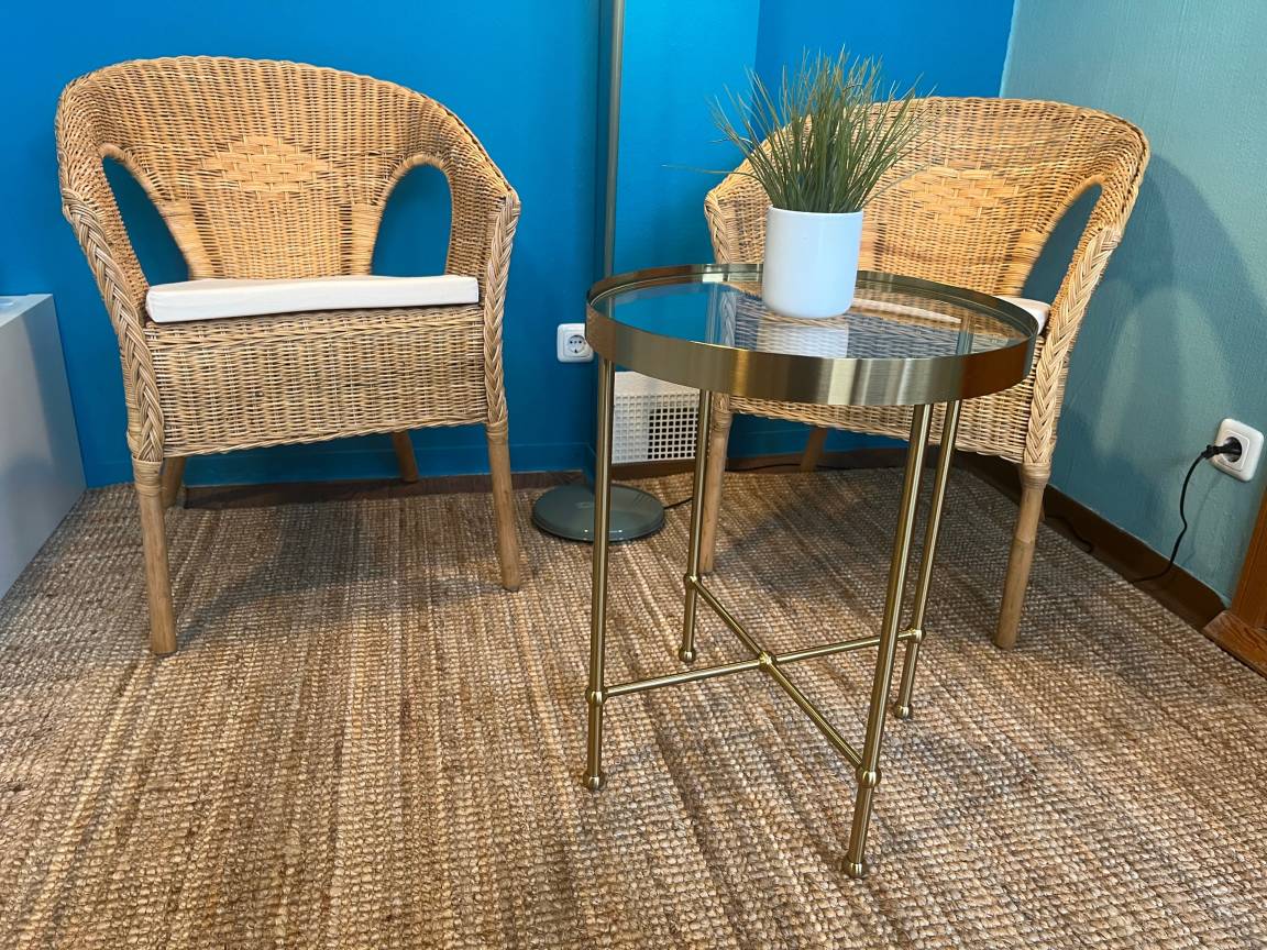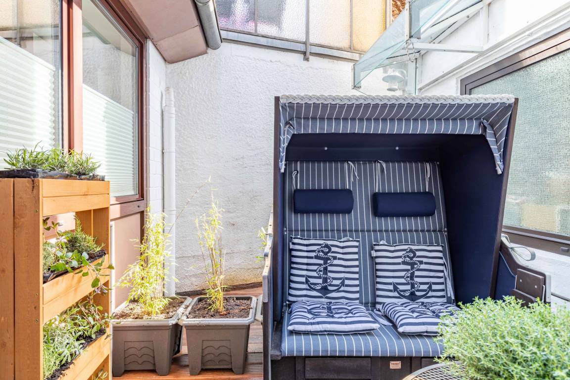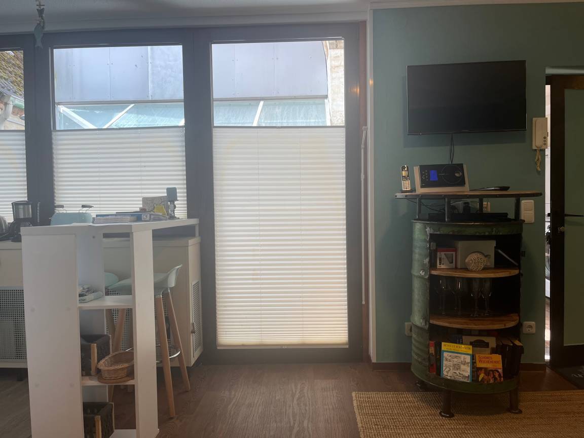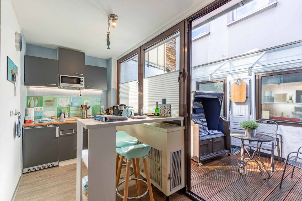 Das etwa 30 qm große Apartment gliedert sich in einen Wohn- und Schlafbereich sowie einen Küchenbereich. Im Wohn-und Schlafbereich finden Sie ein Doppelbett, einen Kleiderschrank, zwei Sessel mit einem Tischchen sowie ein Faßregal. Zudem gibt es ein separates Bad mit Dusche, Waschbecken und WC. Die Küche mit Spüle, Ceranfeld, Kühlschrank, Kaffeemaschinen, Kaffevollautomat und allen anderen Geräten, die im Urlaub benötigt werden, ist vom Wohn- und Schlafbereich durch einen Esstresen mit zwei Barhockern getrennt. Exklusiv von den Gästen des Apartments genutzt werden darf der kleine, begrünte Patio-artige Innenhof mit Strandkorb und Gartenmöbeln. Hier können Sie Ihre Urlaubstage bei einem Glas Bier oder einem Schoppen Wein in stimmungsvoller Atmosphäre ausklingen lassen. Im Flur vor dem Apartment befinden sich eine Waschmaschine und ein Wäschetrockner.