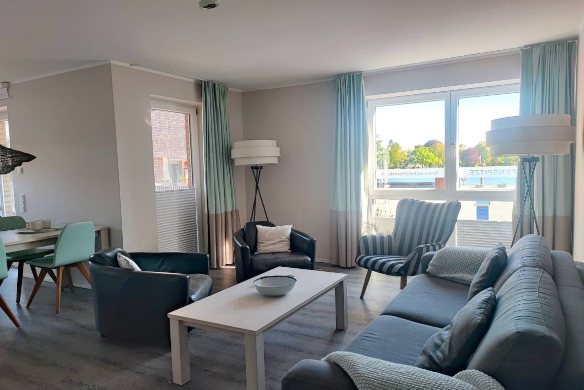 „Die Ferienwohnung haben wir, wie auf den Bildern vorgefunden. Großzügig geschnittene Räume mit viel Stauraum, sehr sauber, tolle Lage und Blick Richtung Hafeneinfahrt/Borby. Und sehr wichtig in Eckernförde der Stellplatz in der Tiefgarage.“