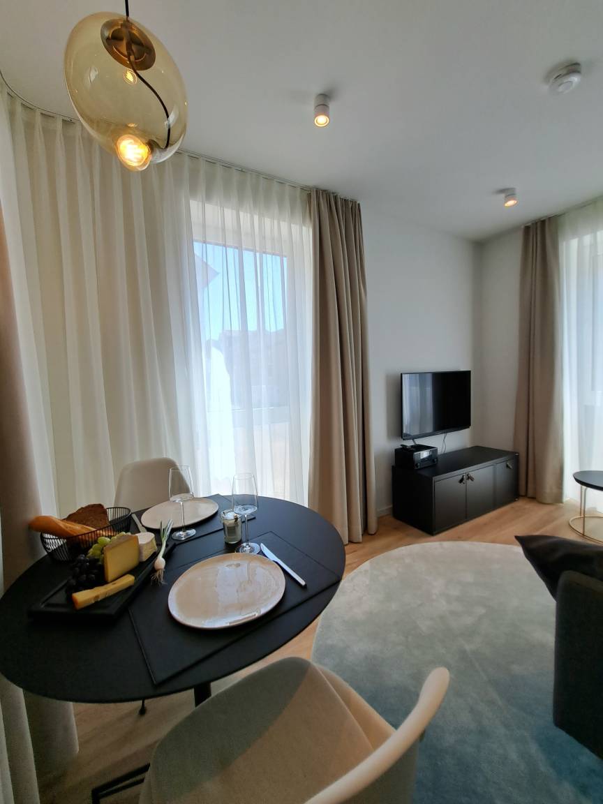 Eine voll ausgestattete, moderne Küche fügt sich offen in den kombinierten Wohn- und Essbereich ein, die Sitzecke mit dem Flachbildschirm und dem Esstisch laden zum Entspannen und Geschichten erzählen ein. Die bodentiefen Fenster mit westlicher und südlicher Ausrichtung durchfluten die Wohnung mit viel Licht.