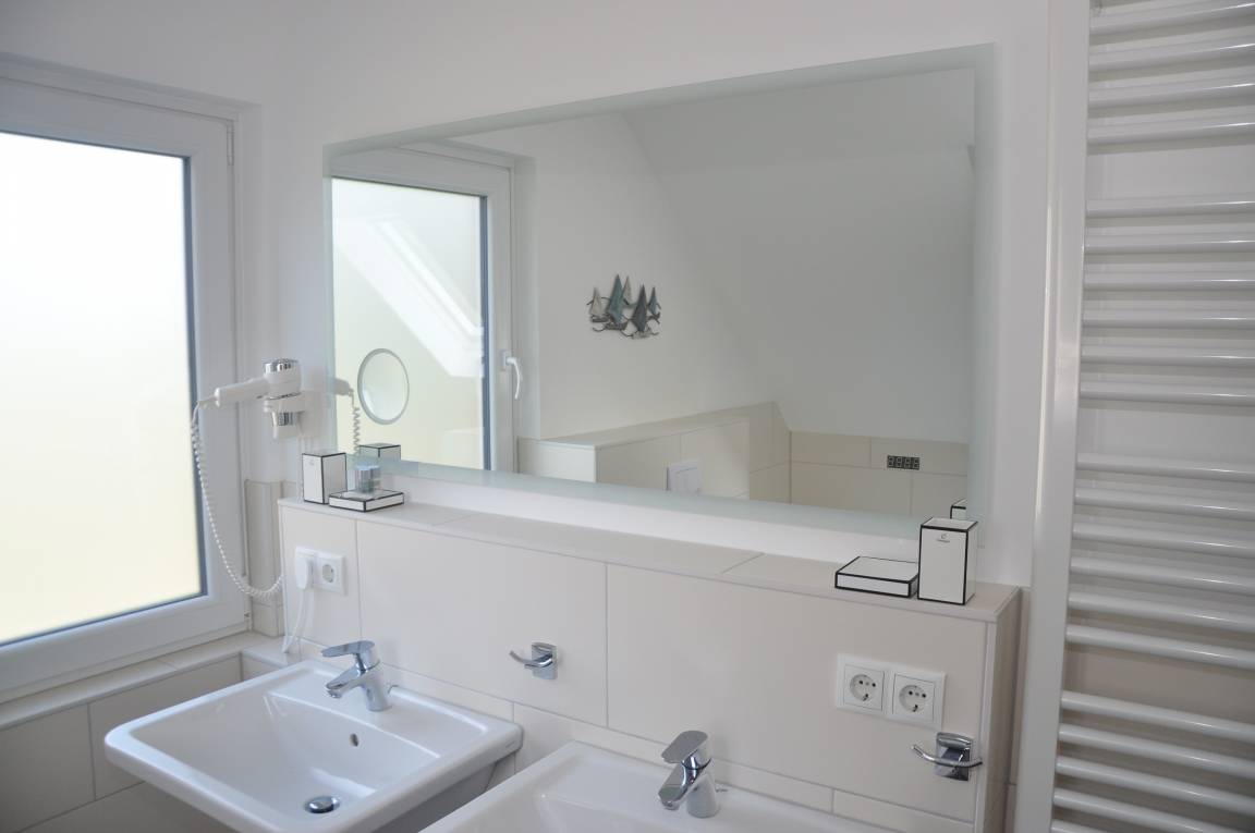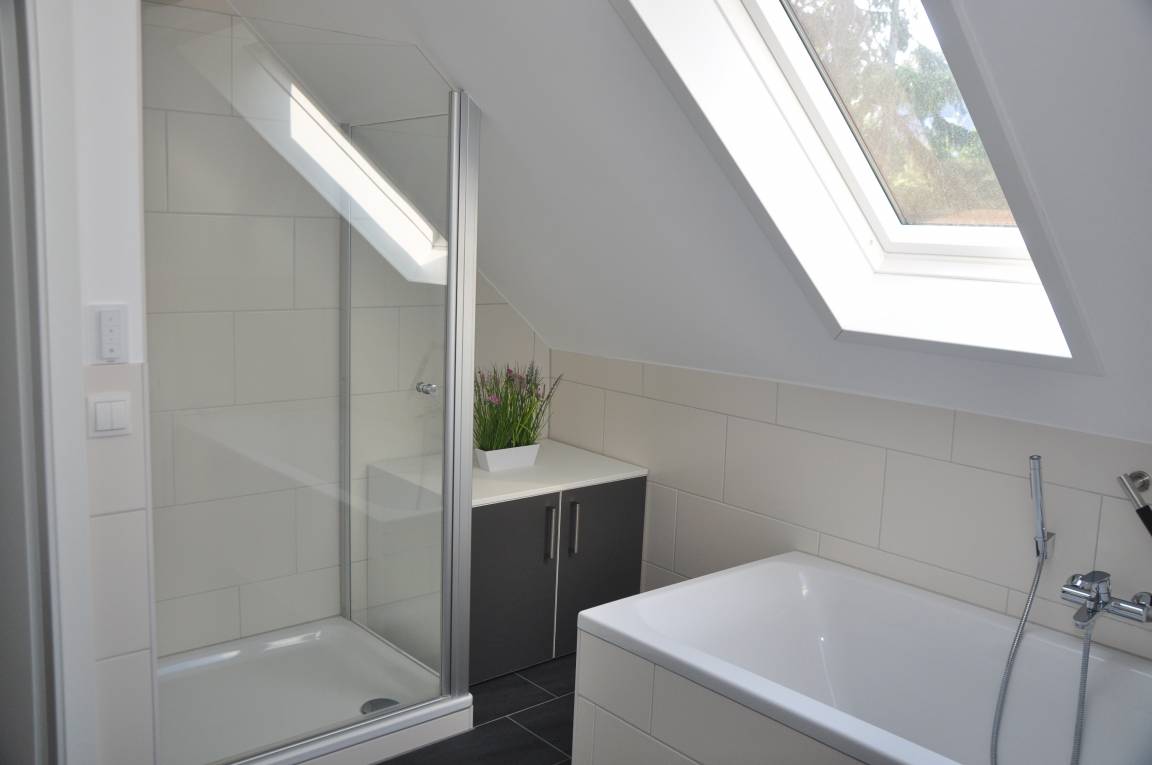 Ein großes Tageslichtbad mit Fußbodenheizung und Sprossenheizkörper, ausgestattet mit XL-Badewanne, großer separater Dusche, Doppelwaschbecken, Haarfön.