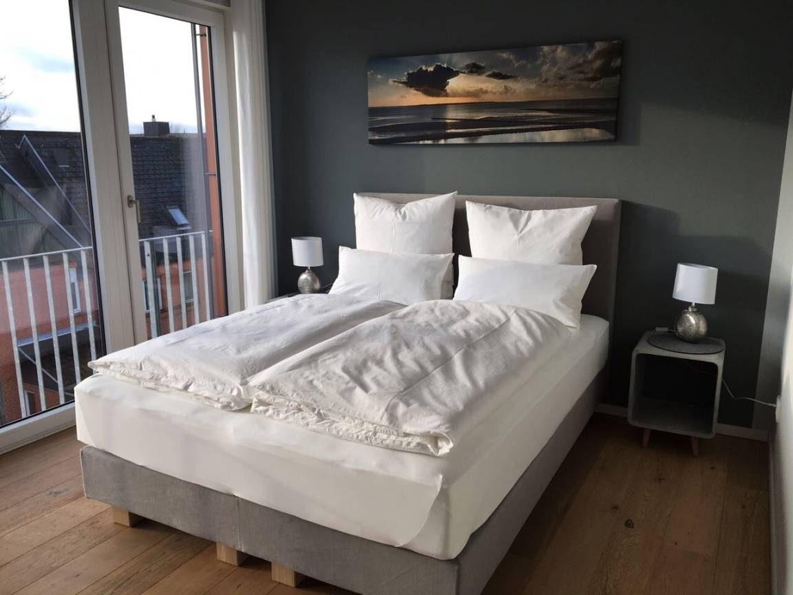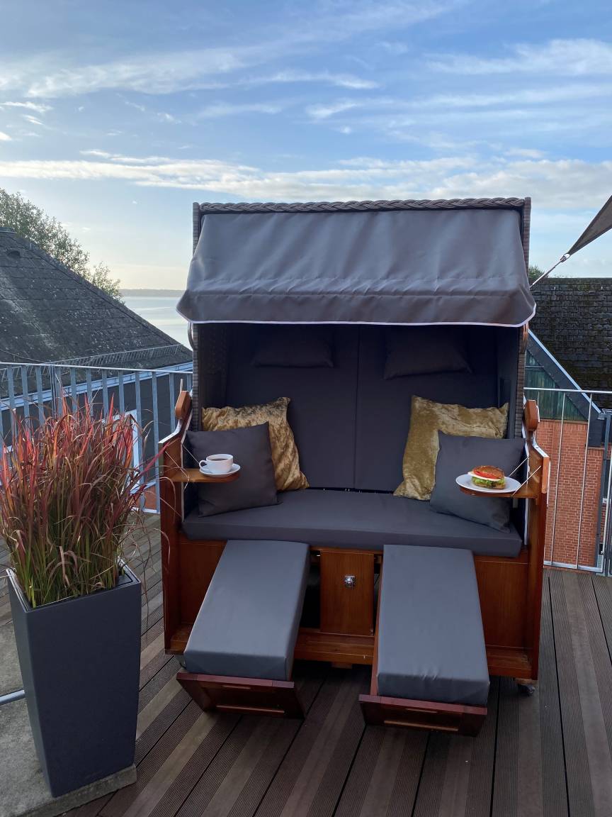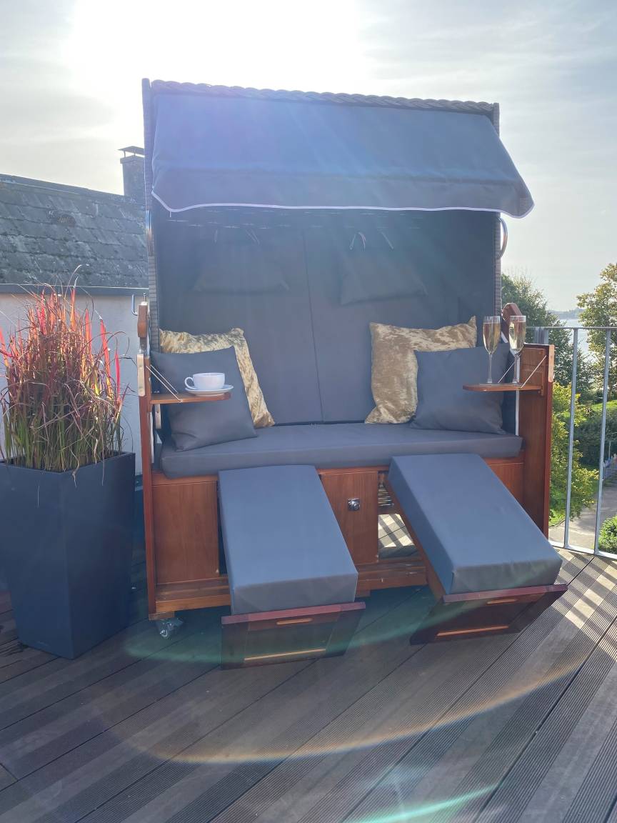 Aus dem Wohnzimmer, einem Schlafzimmer und von der großen (von Nachbarn nicht einsehbaren!) Dachterrasse (35 m²) haben Sie Ausblick auf den Strand. Außerdem befindet sich auf der Terrasse eine Fass-Sauna zur alleinigen Nutzung. Eine tolle Möglichkeit, um Ihre Urlaubstage entspannt zu genießen.