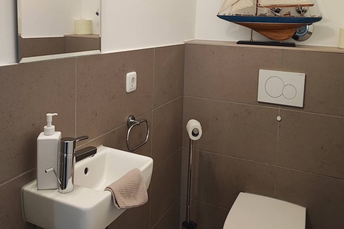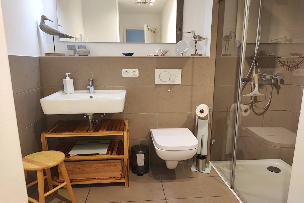 Der mit bodentiefen Fenstern umgebene Wohnraum mit Küchenzeile lädt zum gemeinsamen Entspannen und Kochen ein! Dabei ist der sehr große Esstisch der zentrale Ort im lichtdurchfluteten Wohnzimmer, an dem viel passiert. Hier wird zusammen gegessen, Spiele gespielt, gearbeitet! Die im Hochparterre gelegene Ferienwohnung, mit Hauseingang im Treppenhaus, verfügt über eine am Vormittag sonnige Veranda zur Hafenseite hin. Die hochwertige und voll ausgestattete Küche bietet alles was Sie zum Zubereiten von Mahlzeiten und zum Kochen benötigen. Der Esstisch ist umfasst mit einer lanken Bank und 4 Stühlen und bietet Platz für 6 Personen. Die nächtliche Erholung finden Sie in den zwei Schlafzimmer mit je einem Kleiderschrank ausgestattet. Das Hauptschlafzimmer hat ein modernes Boxspringbett. Im zweiten Schlafzimmer befinden sich zwei Einzelbetten, die jeweils getrennt stehen und auf Wunsch zusammengeschoben werden können. Beide Schlafzimmer verfügen über Verdunklungsmöglichkeiten durch Plissees und blickdichte Gardinen. Das Duschbad ist mit Bodenfliesen und Fußbodenheizung ausgestattet. Die Dusche ist ebenerdig. Das Bad bietet Geräumigkeit und Abstellflächen. Alle Wohnbereiche mit Echtholzboden und Fußbodenheizung.