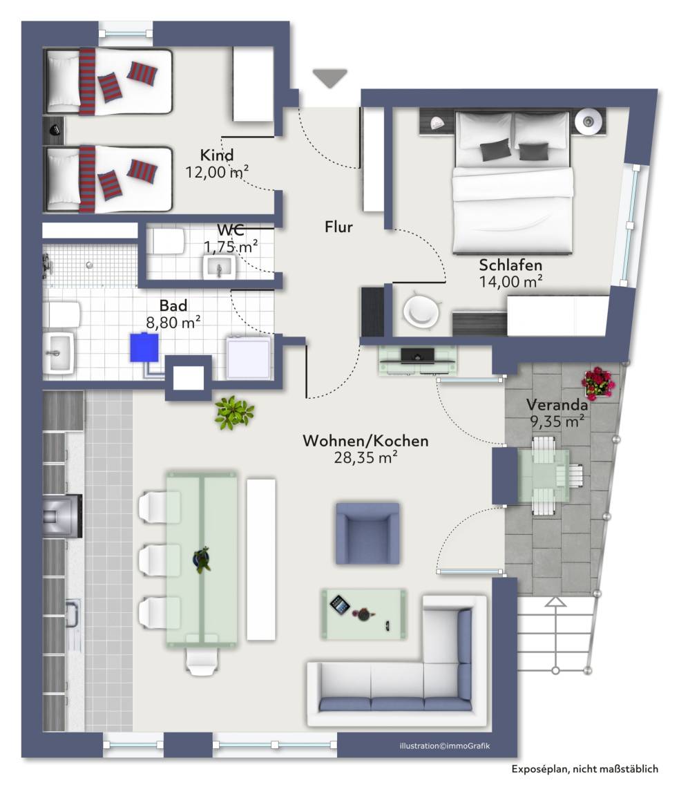 Die im Hochparterre des Appartementhauses gelegene Ferienwohnung kann ''barrierefrei'' über einen Aufzug, mit direktem Zugang aus der Tiefgarage erreicht werden. Die Symbole vom Wohngrundriss können in der Darstellung von der tatsächlichen Innen- und Außengestaltung der Wohnung abweichen!