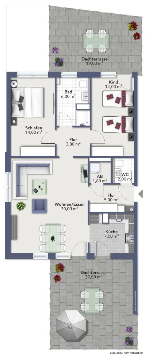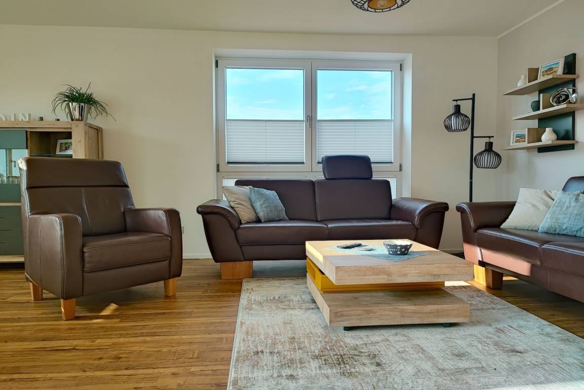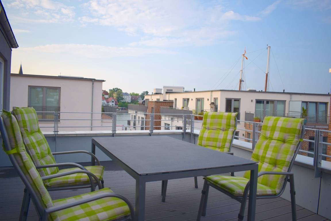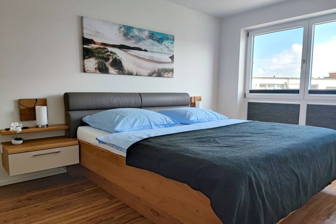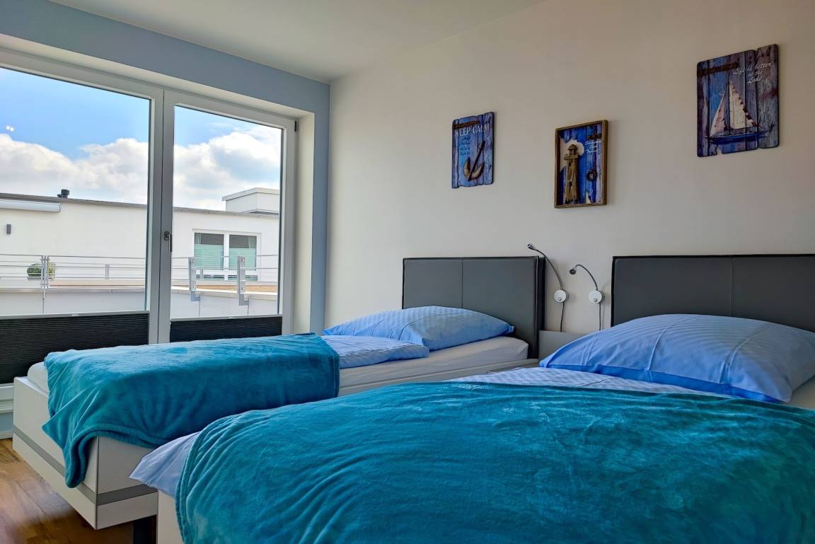 Die Wohnung beeindruckt durch zwei Dachterrassen mit Blick auf das Hafenbecken. Der lichtdurchflutete, offene Wohn- und Essbereich, mit separater voll ausgestatteter Küche, lädt zum gemeinsamen Entspannen und Kochen ein! Ein Schlafzimmer wurde mit einem modernem Doppelbette (180x200), das andere mit 2 Einzelbetten (90x200) und jeweils mit Kleiderschränken ausgestattet, eines verfügt zudem über ein TV-Gerät. Die Schlafzimmer bieten somit die gewünschte Erholung! Die Dusche im Badezimmer ist ebenerdig. Die komplette Wohnung ist mit Vinylboden und Fußbodenheizung ausgestattet.