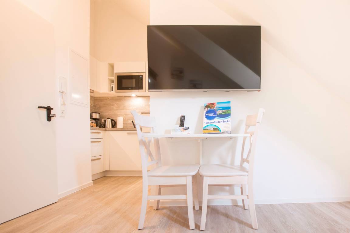 Unsere gemütlich eingerichtete Wohnung Ecke 4 mit ihren 20 m² gleicht einem Hotelzimmer gehobener Klasse, da Sie zusätzlich eine integrierte Küchenzeile nutzen können. Diese ist mit einer Mikrowelle, einem 2-Zonen Kochfeld, Kühlschrank sowie einer Kaffeemaschine ausgestattet.